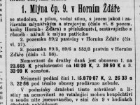 9. srpna 1946: Svaz pro hospodaření s obilím zastavuje dočasně provoz družstevního mlýna v Horním Žďáře „až do konečné úpravy poměrů v mlynářství v pohraničním území“. Nemá být přijímáno nic ke zpracování, stroje se mají konzervovat, plátna vyjmout, aby nepodléhala zkáze; národní správce vše bude chránit před poškozením a zavlečením. (Mlynářské ústředí)