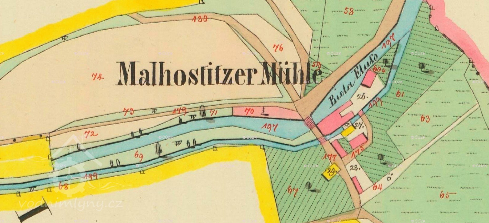 Na půl staré cesty do Malhostic stával až do padesátých let další významný vodní mlýn, z něhož zůstaly pouze trosky a rozvaliny, nejvýše zasypané sklepy. Ještě donedávna se povaloval u ruin mlýna vyvrácený kamenný sokl z kříže. Jedinou zachovanou památkou v této zajímavé lokalitě u malhostického rybníka je kamenný barokní mostek přetínající řeku Bílinu. Je to jednooblouková kamenná stavba, jejíž doba vzniku je datována rokem 1726 na základním kameni, který najdeme nad vrcholem klenutého oblouku mostu.