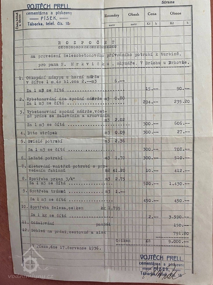 Mezi p. Josef Pravdou mlynářem v Brloze prodávajícím a jeho chotí Anežkou Pravdovou, Josefem Mrkvičkou, kupujícím, na mlýnskou usedlost v Brloze č. 2, jak to stojí a leží se všemi právy na mlýnskou usedlost patřícími, bez všech břemen výměnku a jinými povinosti se všemi zásobami, inventářem živým i mrtvým, bez 2 koní 1 vozu, se všemi stroji ve mlýně a vším strojním zařízením a se řemeny všemi, se všemi polmi a lukami i se sklizní, jak usedlost onu užíval a užívá za cenu 355.000 Kč slovy třista padesát pět tisíc československý. Co závdavek složil na kupní cenu knížku raffazenky z Radomyšle znějící na obnos 11.434,20 Kč na jméno Josefa Mrkvičková znějící.