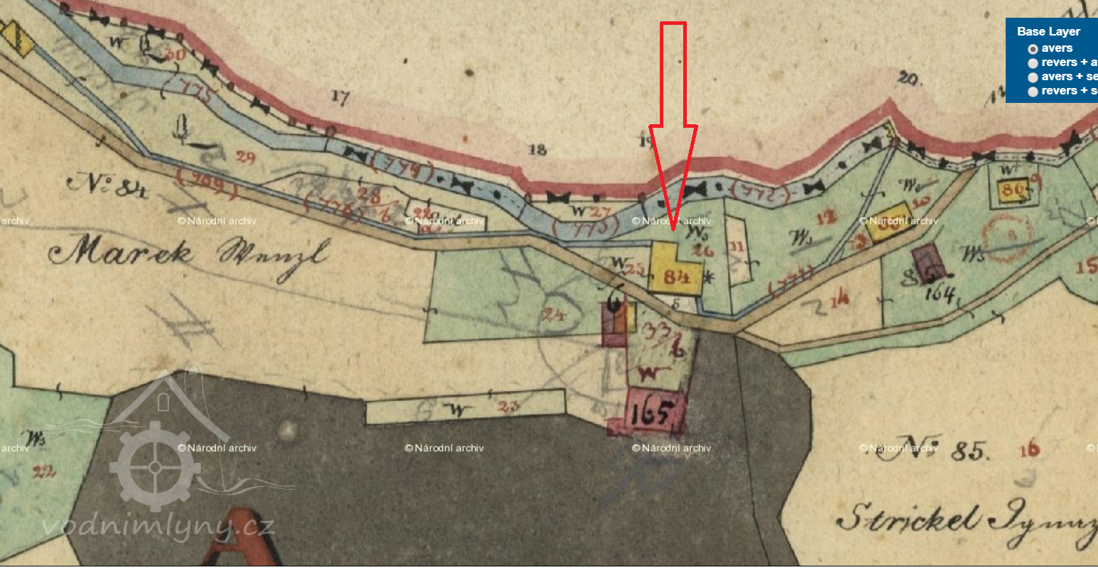 Kadlík pro stavbu sklárny zakoupil u č.p. 84, jejíž součástí byl mlýn (Mádrův) a dva obytné objekty. Mlýn byl využíván jako hospoda pro sklářské robotníky, po zániku sklárny byl přestavěn na rozsáhlé rekreační zařízení, dnešní chata Alba.