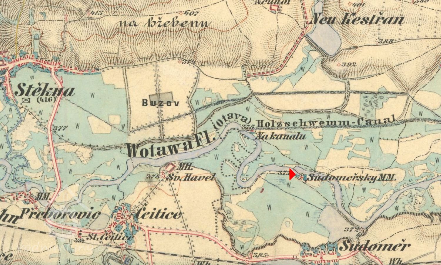 mezi mlýnem a vesnicí byval velký rybník Přítel, po roce 1837 vysušen