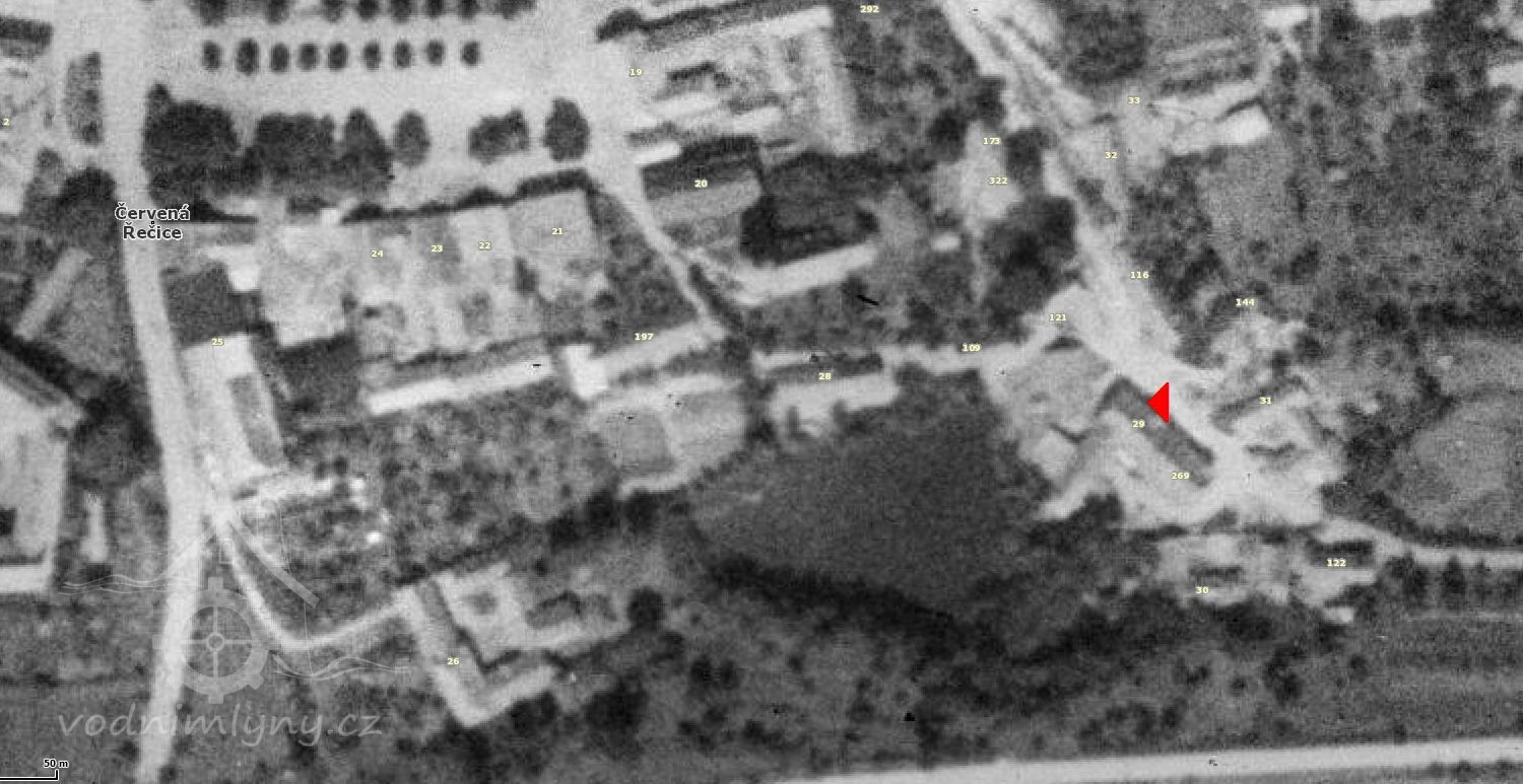 Uprostřed Červené Řečice pod malým rybníkem, který je posledním z řečických rybníků na stejnojmeném potoce, stojí budovy, kde byla v minulém století truhlářská dílna a před tím mlýn (na mapách M.M. - Mahl Mühle). Mlýn matrikami doložen v druhé polovině 17. století. Ve štítě truhlářské dílny zůstalo po mlýně vodní kolo, které stroje v dílně pohánělo.