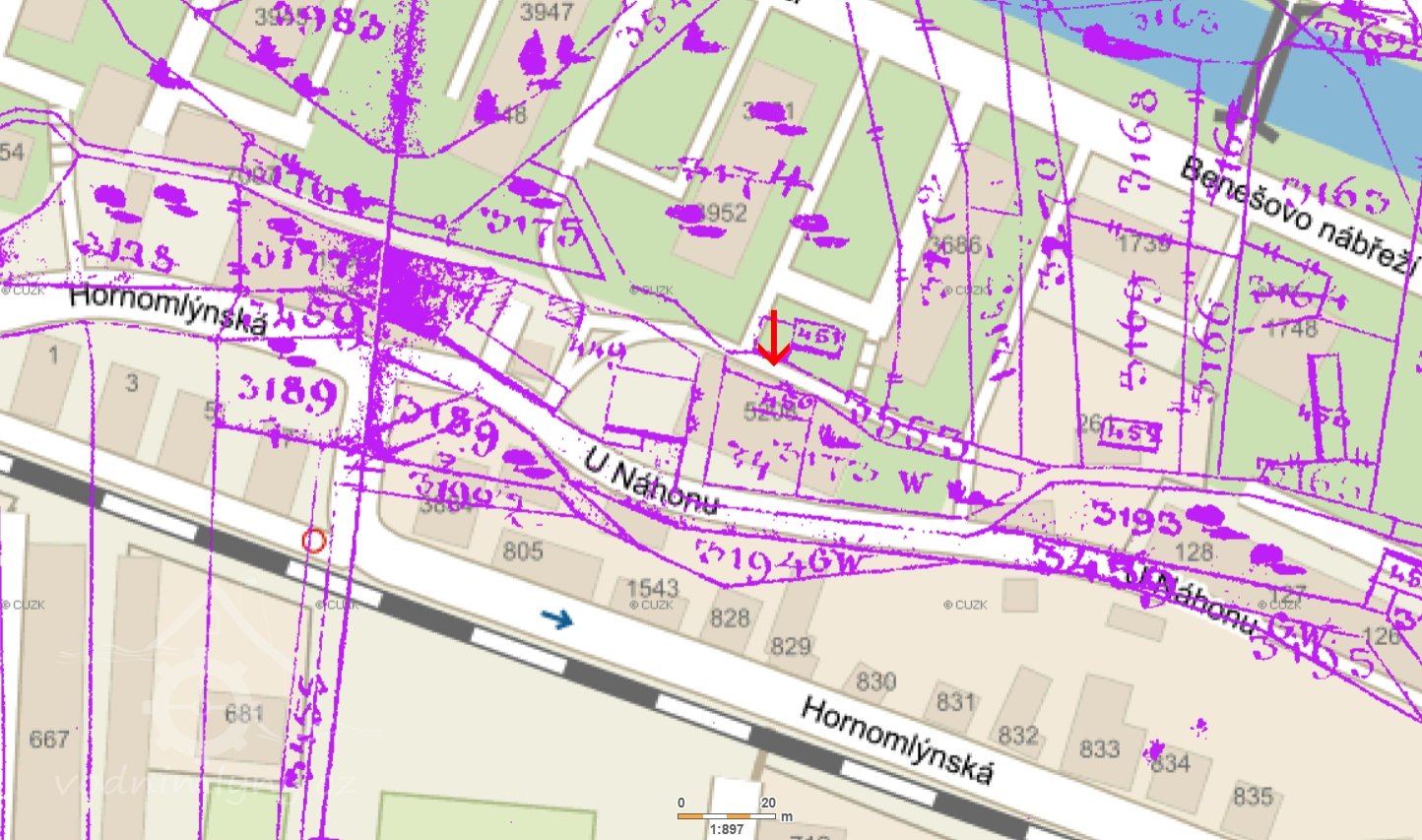 Mlýn stával na rozmezí dnešní ulice Santražiny, ulice Hornomlýnské a Benešovým nábřežím.