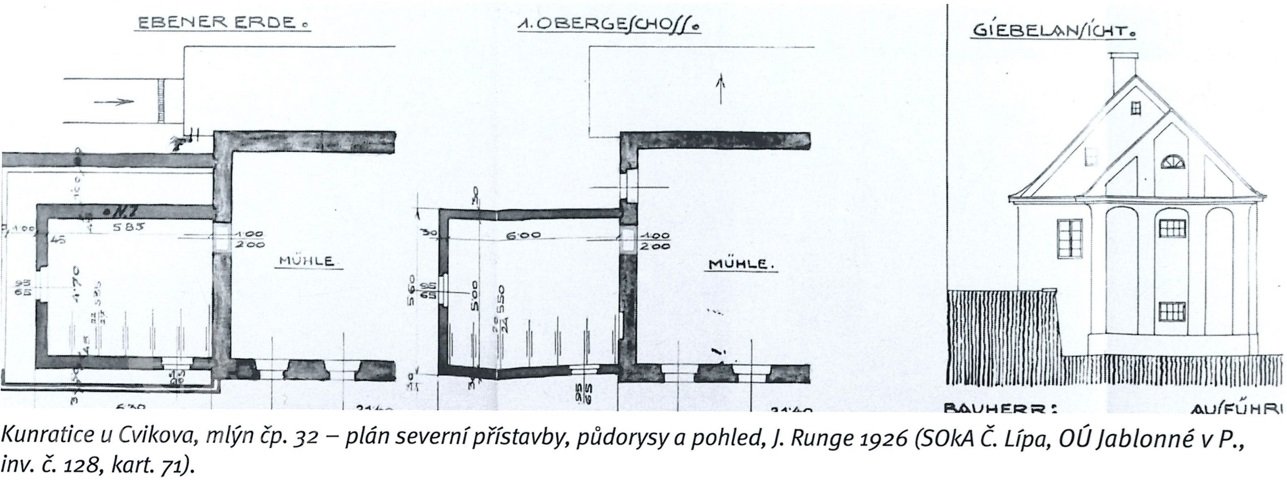Mlýn mlýna spadá do období rozšiřování soustavy mlýnu na zákupském panství v roce 1727. Byl vystavěn na místě staršího selského gruntu. Pro odlišení od staršího mlýna v obci čp. 61 byl vzhledem ke své poloze na toku Svitávky nazýván „Horní“. Mleči v Kunraticích se dělili mezi oba mlýny. Mlýn zpočátku disponoval jen jedním mlecím složením a platilo se z něj 8 zl. na vykrmování vepřů a v naturáliích 2 strychy pšenice a 16 strychů žita. Stavebníkem mlýna byl Anton Bradl, který ho v roce 1737 prodal Johannu Frantzovi Bradlovi, pilaři ze Cvikova, za 500 zl. Po něm zde hospodařil jeho syn Josef, který za mlýn zaplatil 1000 zl. (Tehdy je uveden i inventář - mj. truhly, 4 oškrdy a měrné nádoby na mouku a obilí.)