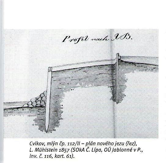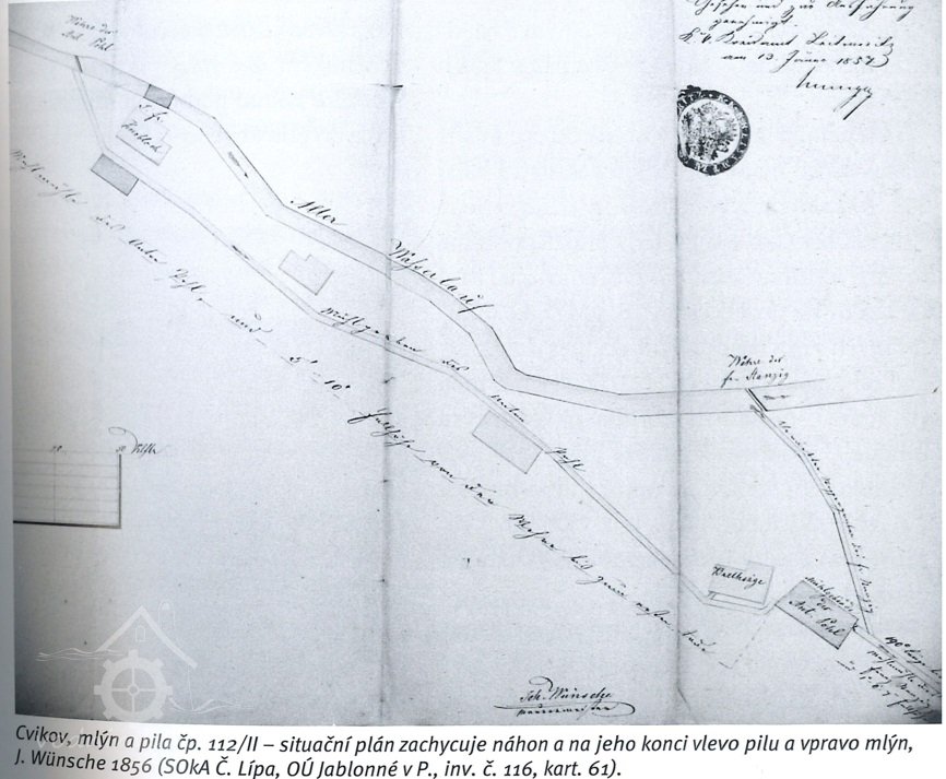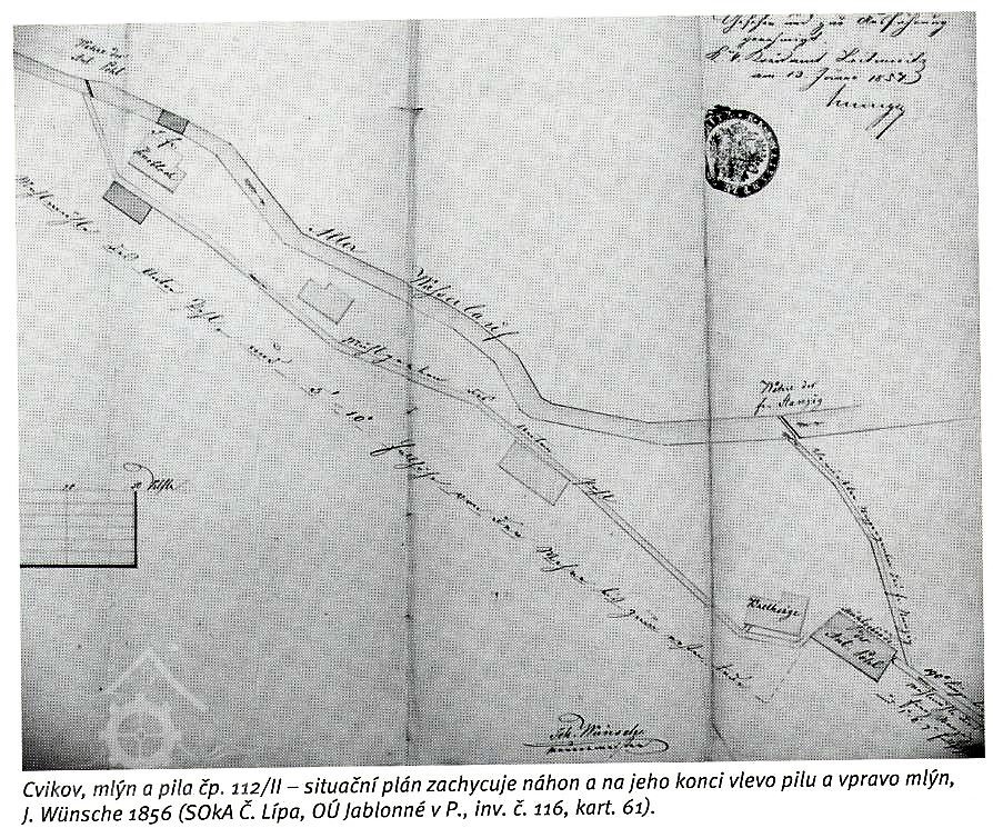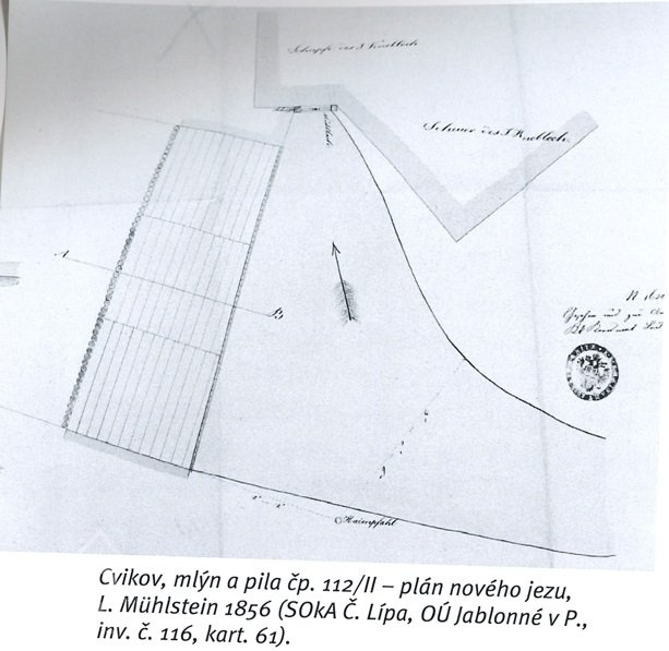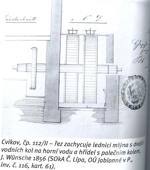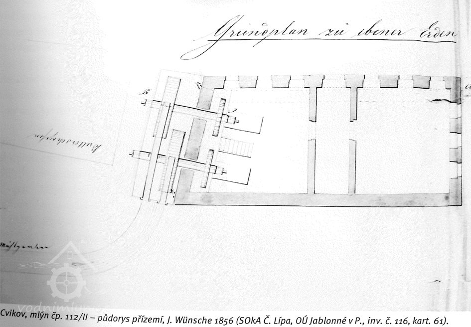 Existence mlýna v tomto objektu potvrdila plánová dokumentace z roku 1856, schválená začátkem roku 1857 Krajským úřadem v Litoměřicích. Plány zachycují existující stavby pily a mlýna, jejich majitelem byl Anton Pohl. Dle plánu vypracovaného zednickým mistrem Johannem Wünschem v roce 1856 byla v lednici osazena dvě vodní kola na vrchní vodu řazená vedle sebe ve dvou úrovních. Ke každému kolu vedly samostatné dřevěné vantroky.