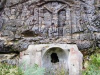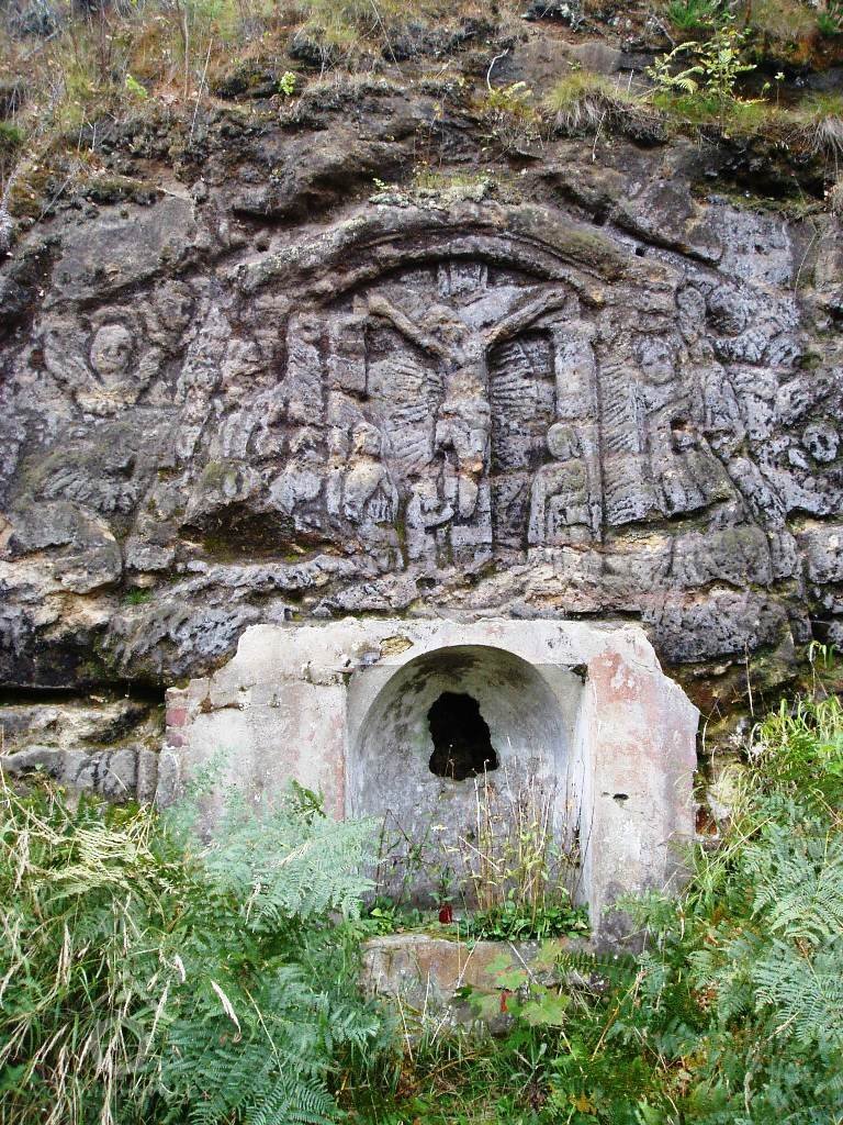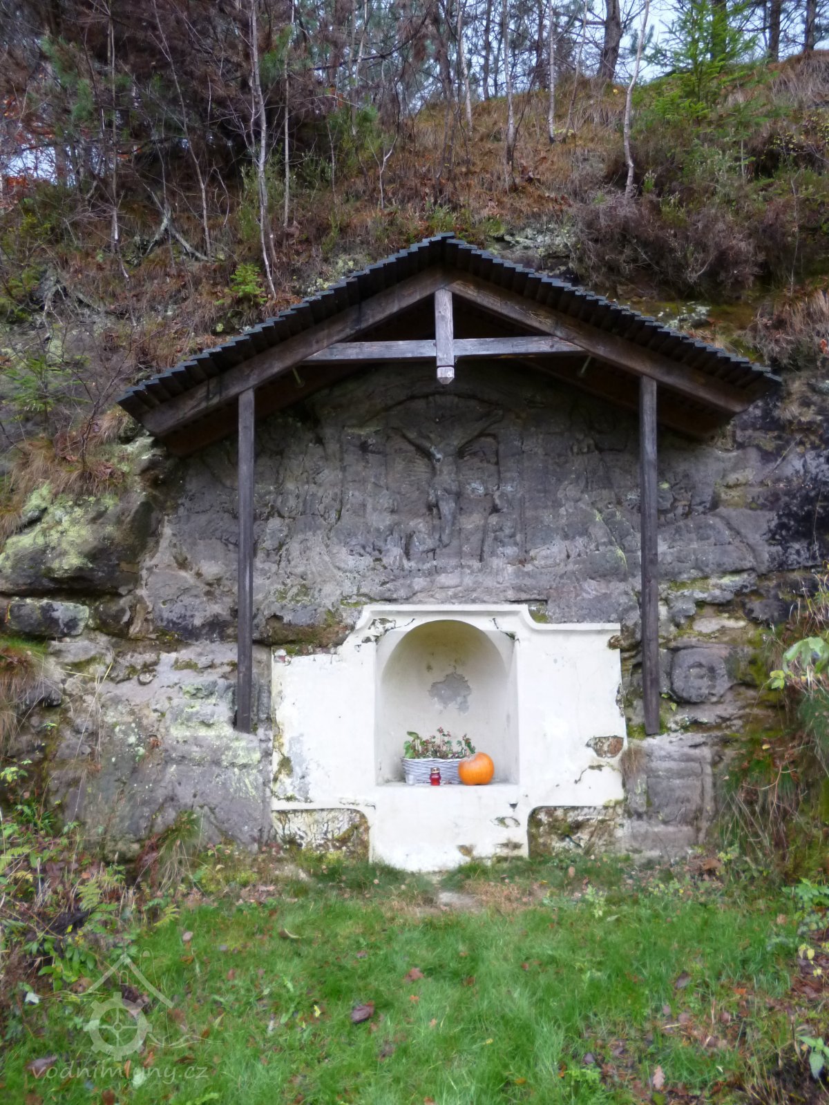 Reliéf Ukřižovaného Za touto lidovou plastikou, na které je zdejší kraj mimořádně bohatý, je ve skále vytesán náhon, který do mlýna přiváděl vodu z Hamerského potoka (resp. z dnes již zaniklého rybníčku nad silnicí Mařenice - Naděje)., 2008, © Vladimír Kraus, (Prvky na obrázku: náhon)