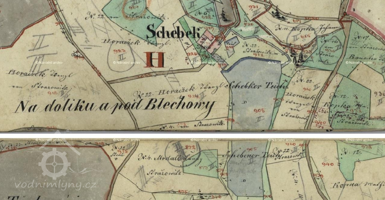 Na samotě U Šebkova rybníka, kterým protéká Vlkonický potok, ve Strážovicích se nalézá mlýnské stavení s číslem popisným 22. Mlýn eviduje i Sommer, ovšem pod mírně zkomoleným jménem Schobek. Vodní kniha udává jako dřívějšího majitele mlýna a rybníka Jana Jonáše, poté Františka a Josefu Kramperovi. K ocejchování vodního díla došlo 13. září 1883. Nástupcem Františka Krampery se stal Antonín Krampera, který 28. února 1913 získal od okresního hejtmanství v Benešově živnostenský list. František Krampera zemřel asi roku 1920.