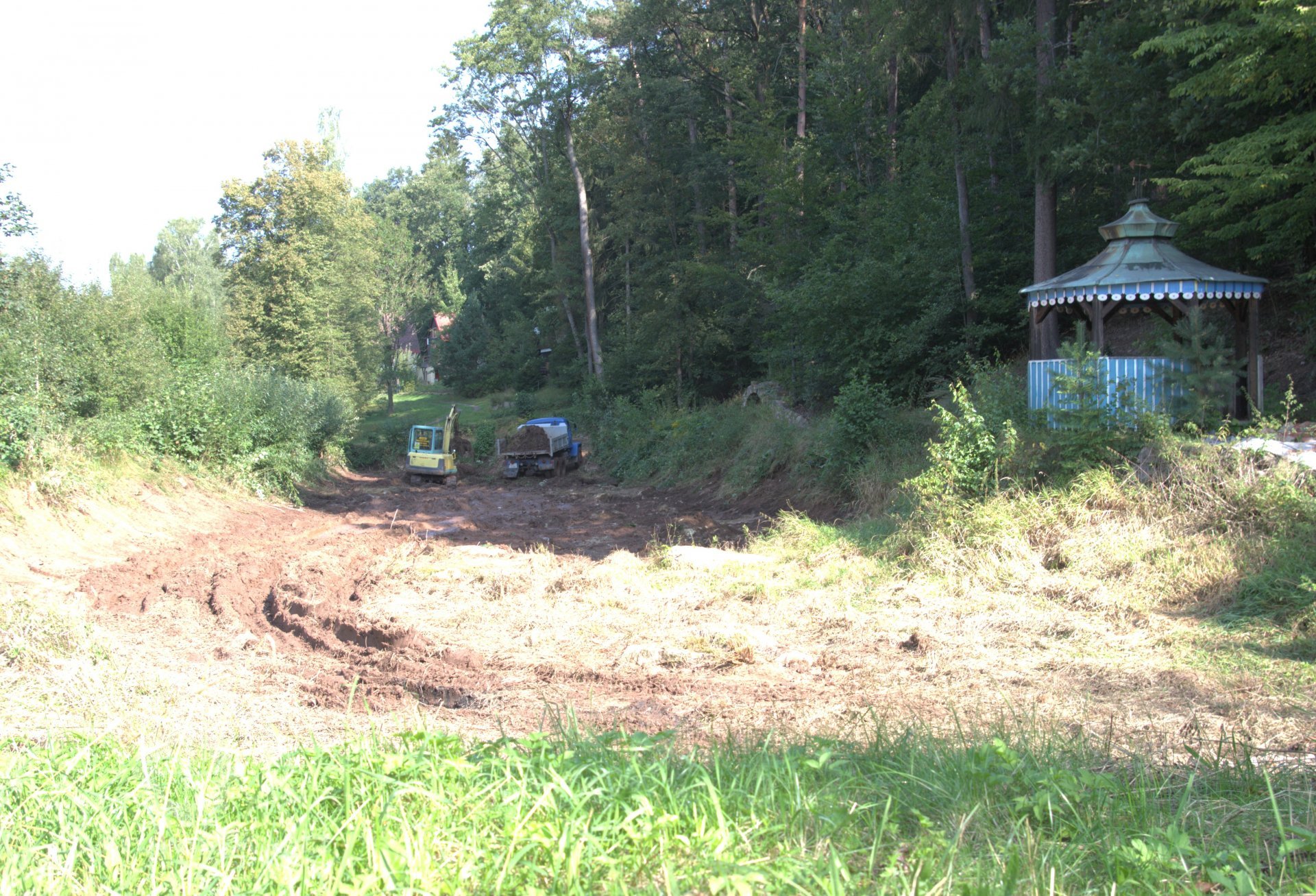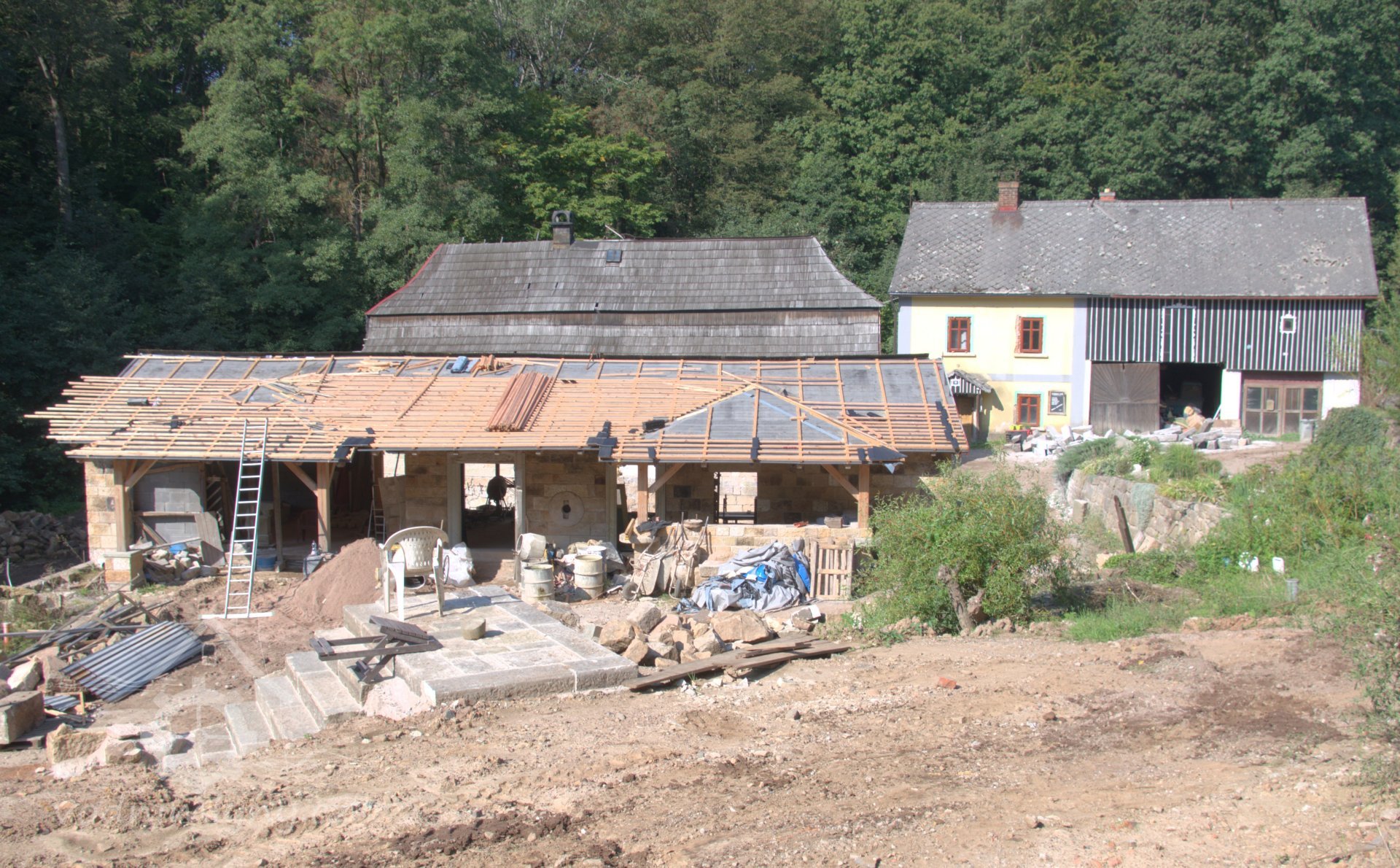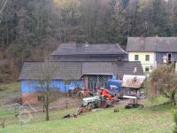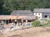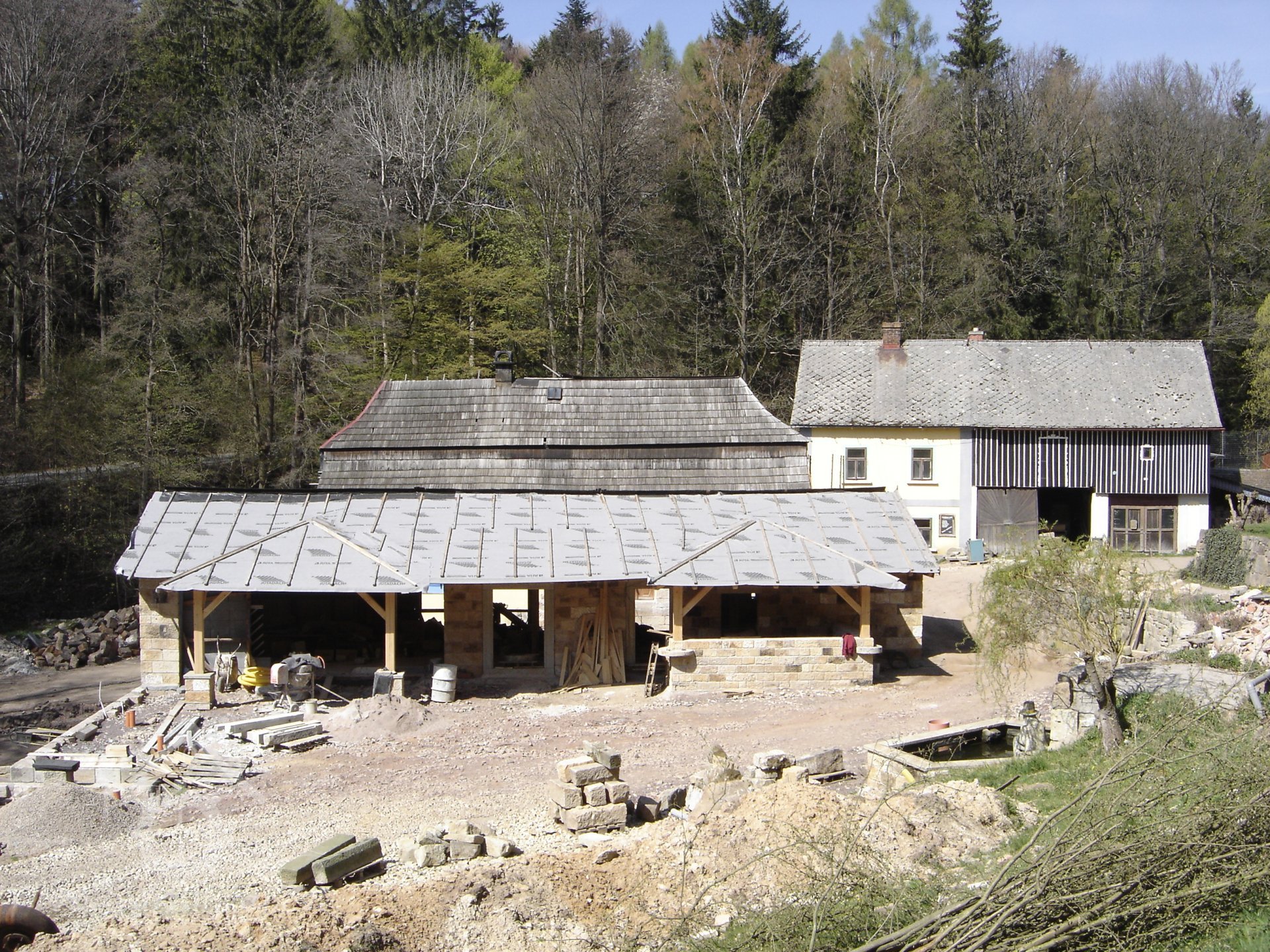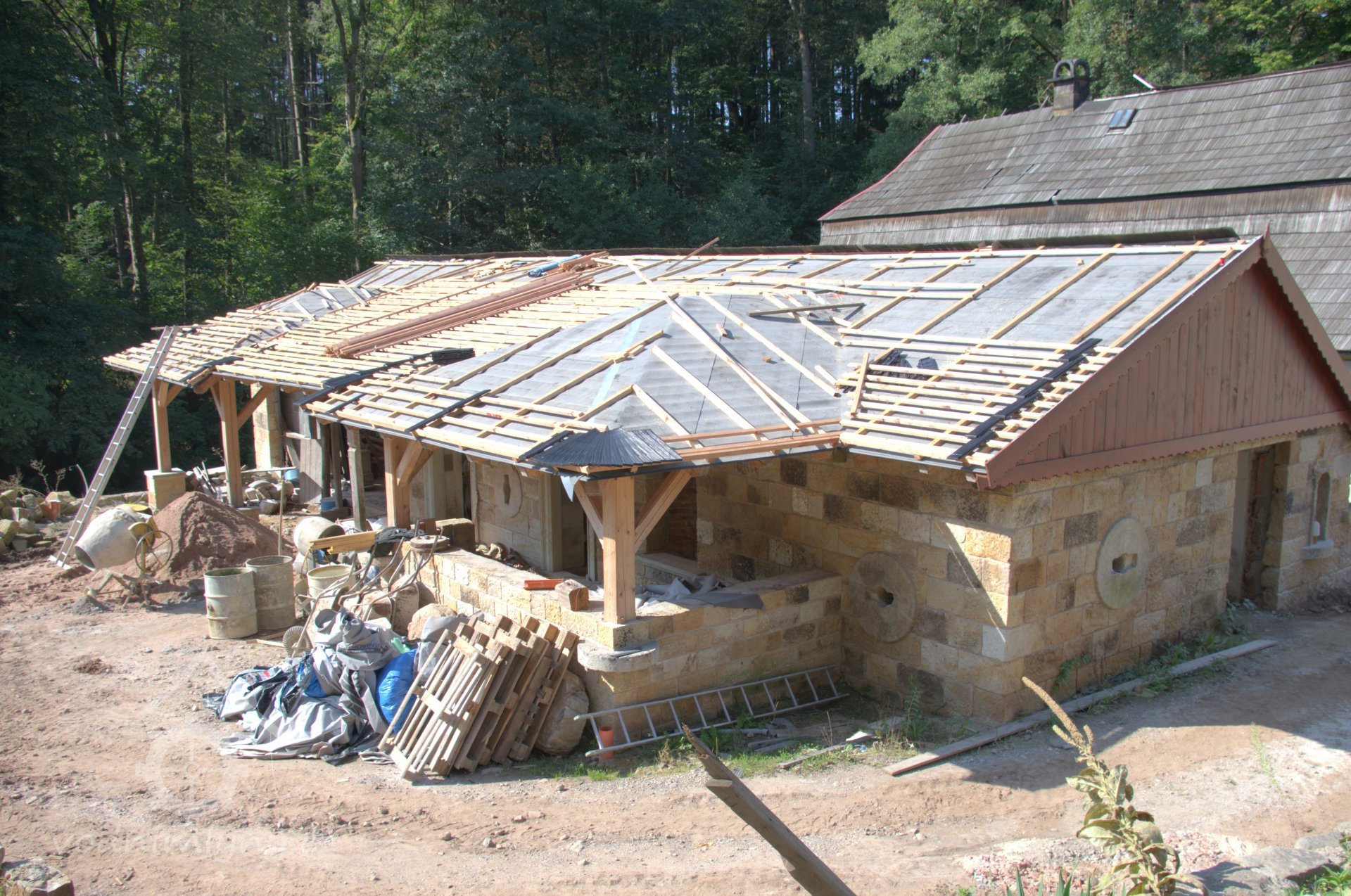 V létě roku 1945 (na národní výzvu o osídlování pohraničí po II. světové válce), zažádal příslušné úřady o přidělení opuštěného mlýna pan Václav Červený I. (můj děda ze strany otce), nar. 28. 9. 1904 v Jaroměří, zemř. 30. 6. 1977 v Komárově, vyučený jako mlynářský tovaryš - za války zaměstnán jako mládek ve mlýně Dvůr Králové n.L. - Verdek. Celý komplex: Mlýn, pekárna a pila včetně okolních pozemků, pole, louky, les, rybníky atd., byl v majetku paní Anny Patzak, která musela vše opustit a jako Němka spadala do odsunu z pohraničí v prvním sledu. Po jejím odchodu projevili o mlýn zájem bratři Sokolíkové. Byli to ale zřejmě jen "zlatokopové", kteří tu pobyli pouze několik týdnů. Údajně vše prohledali, co mělo pro ně nějakou cenu tak odvezli a aniž by vůbec zažádali o přiděleni, tak zase zmizeli. Bezprostředně po jejich odchodu přišel děda s plnou hlavou ideálů. Po pár měsících zkoušek a drobných úprav děda mlýn spustil na stávajícím zařízení. Místní sedláci jezdili s pšenicí k semletí, ale protože jejich finanční možnosti se rovnaly téměř nule a hotovosti nikdo z nich neoplýval, tak v drtivé většině bylo mleti a šrotování na dluh. Systém: Děkuju ti Václave a srovnáme to příště, nemohl zákonitě fungovat dlouho. Tento stav vedl dědu k rozhodnuti, že se mlýn odstaví a po dobu kompletní rekonstrukce bude v celoroční činnosti pouze pila. Předpokládal, že se po dobu odstávky taky trochu zlepší finanční možnosti zákazníků. Zařízení pily bylo v solidním stavu a strojový park měl dostatečně pokrýt tehdejší poptávku po řezivu a trámech na opravy opuštěných a zchátralých usedlosti v okolí, kam se čas od času nastěhovali nově příchozí osídlovatelé. Následovalo období, kdy bylo potřeba namalovat a schválit nějaké plány, vyměnit rozmístění strojů a skloubit veškeré návaznosti. Po vyhotoveni seznamů, přišlo na každodenní shánění všeho potřebného. Veškerá povoleni, dohody o dodání a montáži mlynářského zařízení, dohody o stavebních změnách a úpravách, objednávky řemeslníků na stavbu turbín, betonování vstupních šachet turbín v hrázi rybníka, oprava hráze, vyčištěni rybníka a náhonu, elektromontéry na rozvody atd. atd. Je až nepředstavitelné, že tohle všechno musel děda s tátou obstarat a všechny návštěvy u dodavatelů absolvovat vlakem nebo na kole. Na žně v létě 1947 byl mlýn plně připraven. Rekonstrukce byla provedena vskutku v téměř rekordním čase jednoho roku a několik měsíců. V přízemí byly namontovány 3 válcové stolice, šrotovník, váha a pytlovačky. V patře u vikýře nad vchodem do mlýnice byly nad jednotlivými stolicemi násypky pro obili a po levé straně (při pohledu z průčelí) vertikální válcové zásobníky. V podkroví (na straně k potoku) byla třídička, v hantýrce mlynářů - pláncichtr, což byla v podstatě soustava za sebou jdoucích kmitacích sít o různé hrubosti pláten na třídění zrnitosti mouky (od hladké až po krupici). Z tohoto nejvyššího místa mlýnice byla mouka šupnami sypána do zásobníků v patře a odtud dále do pytlovaček v přízemí. Plevy jako odpad ze šrotovníku a otruby byly sypány do sklepa, do prostor chlévů. Mezi pilou a mlýnem byly v suterénu, cca 3 m pod úrovní hladiny vody v rybníku namontovány dvě Francisovy turbiny s možností spřažení. Znamenalo to, že mohl fungovat jak katr na pile, tak i současně mlýn, každý na jednu turbínu, ale samozřejmě s omezeným výkonem. Pokud bylo potřeba rychle a hodně řezat, nebo rychle a hodně mlít, tak se turbíny spřáhly (skuplovaly) a znásobením síly se vytvořil požadovaný výkon. Pekárna plnila svůj účel jen zřídka. Pekl se pouze chleba a jen jednou v týdnu. Její zařízení si nepamatuju. Vím jen, že dole vpravo byla poměrně velká pec, kterou někdy okolo roku 1960 můj otec zboural, místnost přepažil a vytvořil obývací pokoj. Současně vybudoval pod schody do patra WC. Původní suchý záchod byl až v kůlně za garáží. Dodnes mám před očima to nádherné a řemeslně perfektně zpracované zařízení. Hladkost a slícovanost veškerých bukových prken a latěk kryjících zásobníky, světle žlutou barvu vynášecích dopravníků a celkové bandáže strojů. Lesklou černou barvu v kombinaci s temně bordovou na ocelových a litinových částech stolic, řemenic a soukolí transmise. Vycíděné skleničky odkapávacích maznic na třecích ložiskách hřídelů atd...