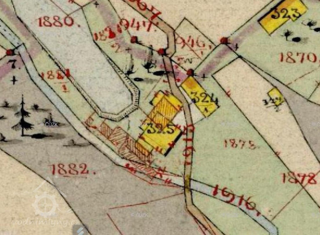 Mlýn byl postaven v roce 1717 a přestavěn 1920. Majitelé: Friedrich Erben - 1717, Christian Erben - 1769, Alois Erben - (?), Gabriel Hampel – 1816, Wenzel Hampel - 1843, Ignatz Barth – 1853, Marie Barth – 1862, Josef Tins – 1878, Franz Schenk – 1905, Karl Schenk do r. 1945.