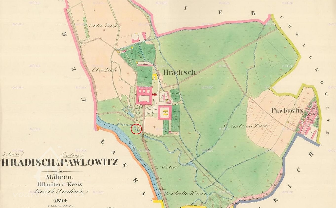Nacházel se v místech, kde se dnes dělí cesta k vojenské nemocnici klášter Hradisko a do Černovíra, původně u širokého dřevěného mostu na tzv. Hájecké struze, začínající v dnešním moku Moravy u železného mostu a dále pak tekoucí kolem jižní strany klášterních budov a původní klášterní zahrady. Odedávna se mlýn nazýval mlýnem klášterním (Klostermühle) nebo také podklášterním, podle jeho umístění i majitele - kláštera Hradisko.