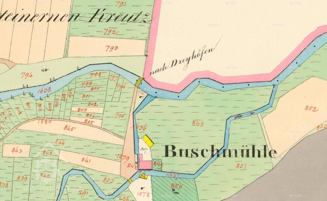 Místní část Litovle zvanou Pavlínka uzavírá historický mlýn Pošmýl (z německého Busch = křoví).