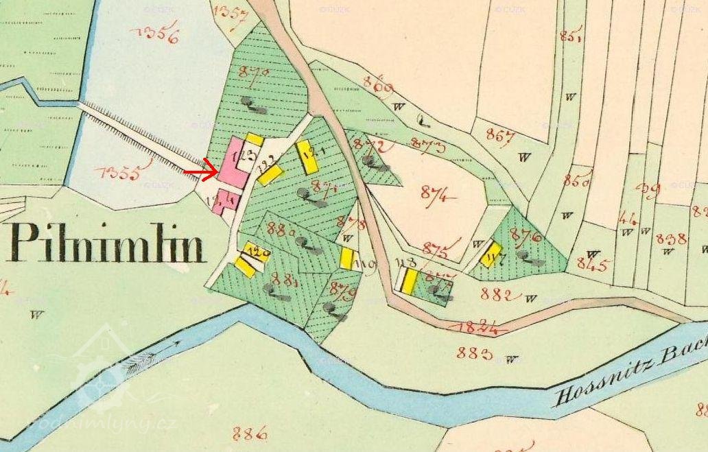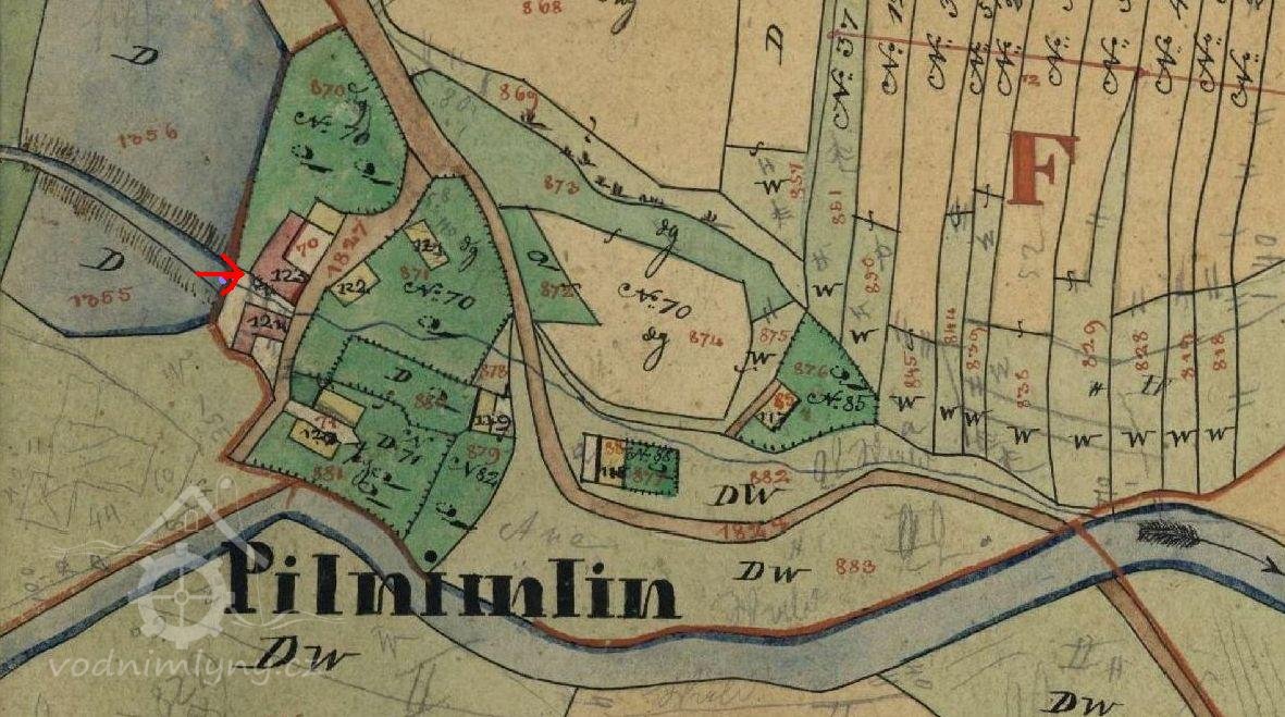 K mlýnu také tehdy patřilo více než 20 jiter pozemků. Roku 1836 měl Pilný mlýn čp. 70 a náležel Janu Pflegerovi.