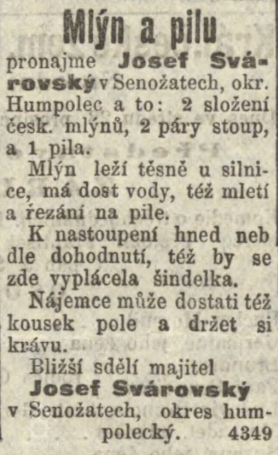 SOA Třeboň digitalizované pozemkové knihy Premonstrátů Želiva. Tam jsou údaje že můj pra... předek zakoupil mlýn v Senožatech zvaný Jankovský v roce 1653. Od té doby tam po určitou dobu se střídali mlynáři Vrzákové, po úmrtí posledního syna Antona převzal mlýn rod Veselých. (info Vrzák)
