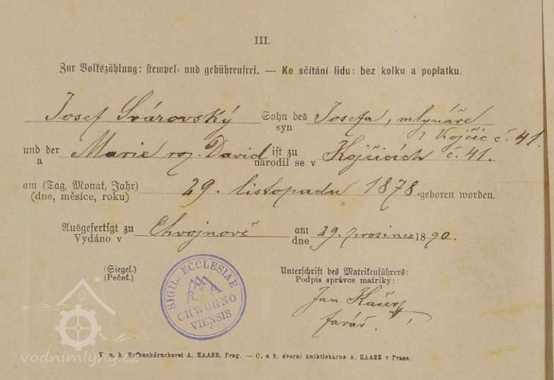 1890 zde byl mlynář Josef Svárovský, syn mlynáře Josefa Svárovského z Kojčic 41. V r. 1898 nabízel mlýn k prodeji. (RR)