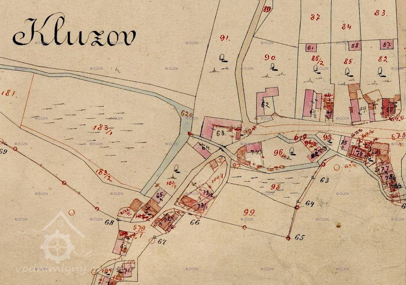Mlýn na Kluzově, tzv. Kaděrův mlýn se nacházel uprostřed osady. Původně tato nemovitost patřila vrchnosti z Chudobína, která na mlýn dosazovala mlynáře. Na mlýně pracovalo poměrně mnoho rodinných i cizích občanů. Marie Sobrová (Navrátilová) ze Seničky zde vařila pro 16 strávníků každý den. Kromě mletí obilí sem jezdili formani pro led, který se zde vyráběl. Ten pak vozili po okolních hospodách.