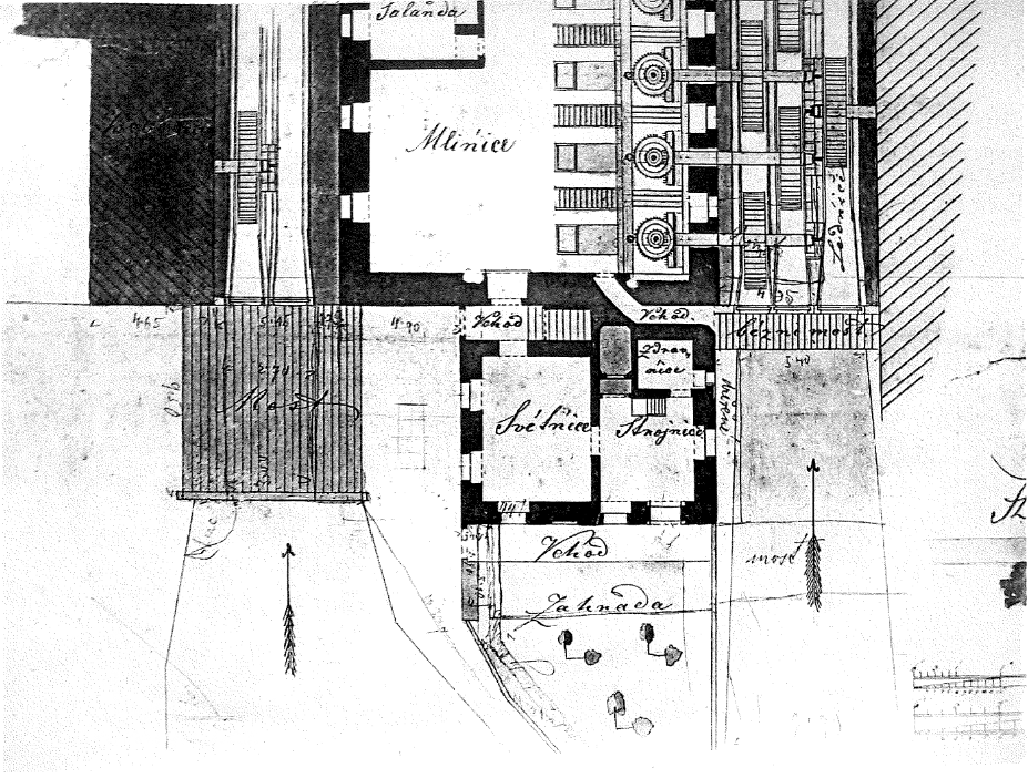 1901: pila na pravém břehu náhonu, 13,4 m dlouhá, 5,3 m široká, spočívá na dřevěných sloupkách, prkny obedněná a zakrytá šindelem