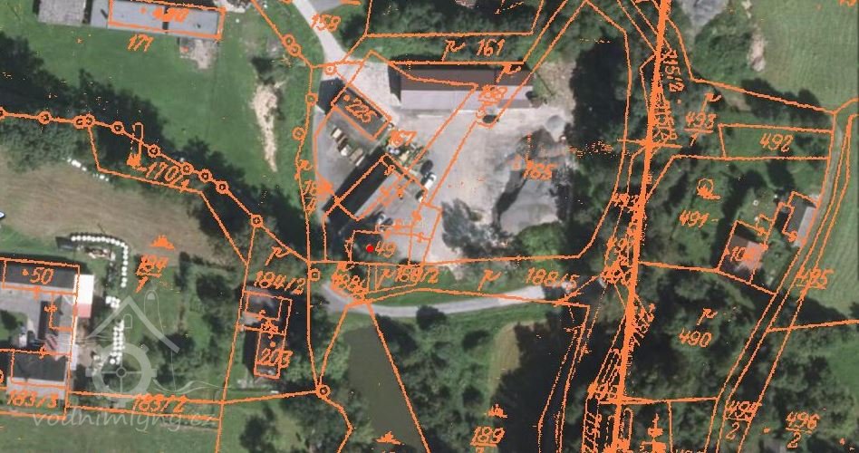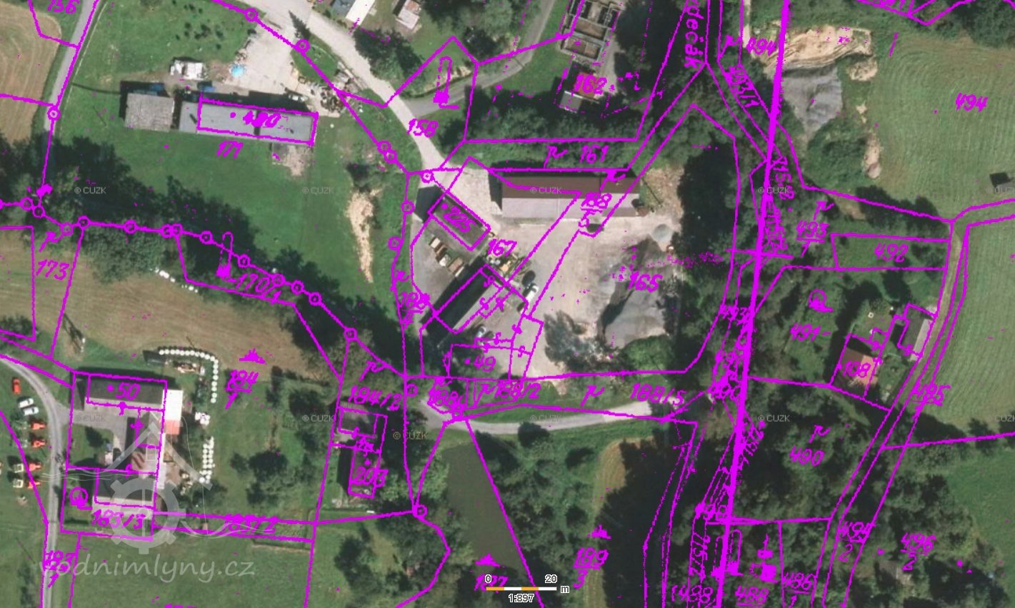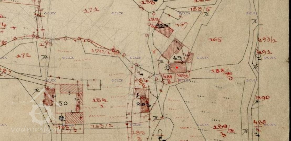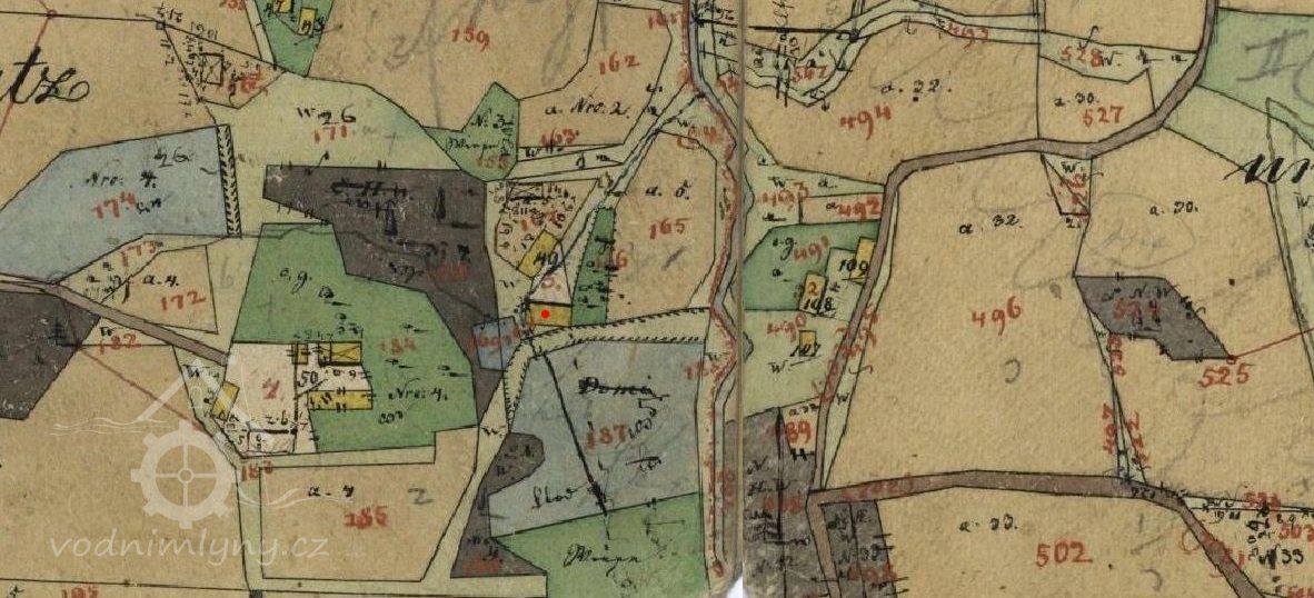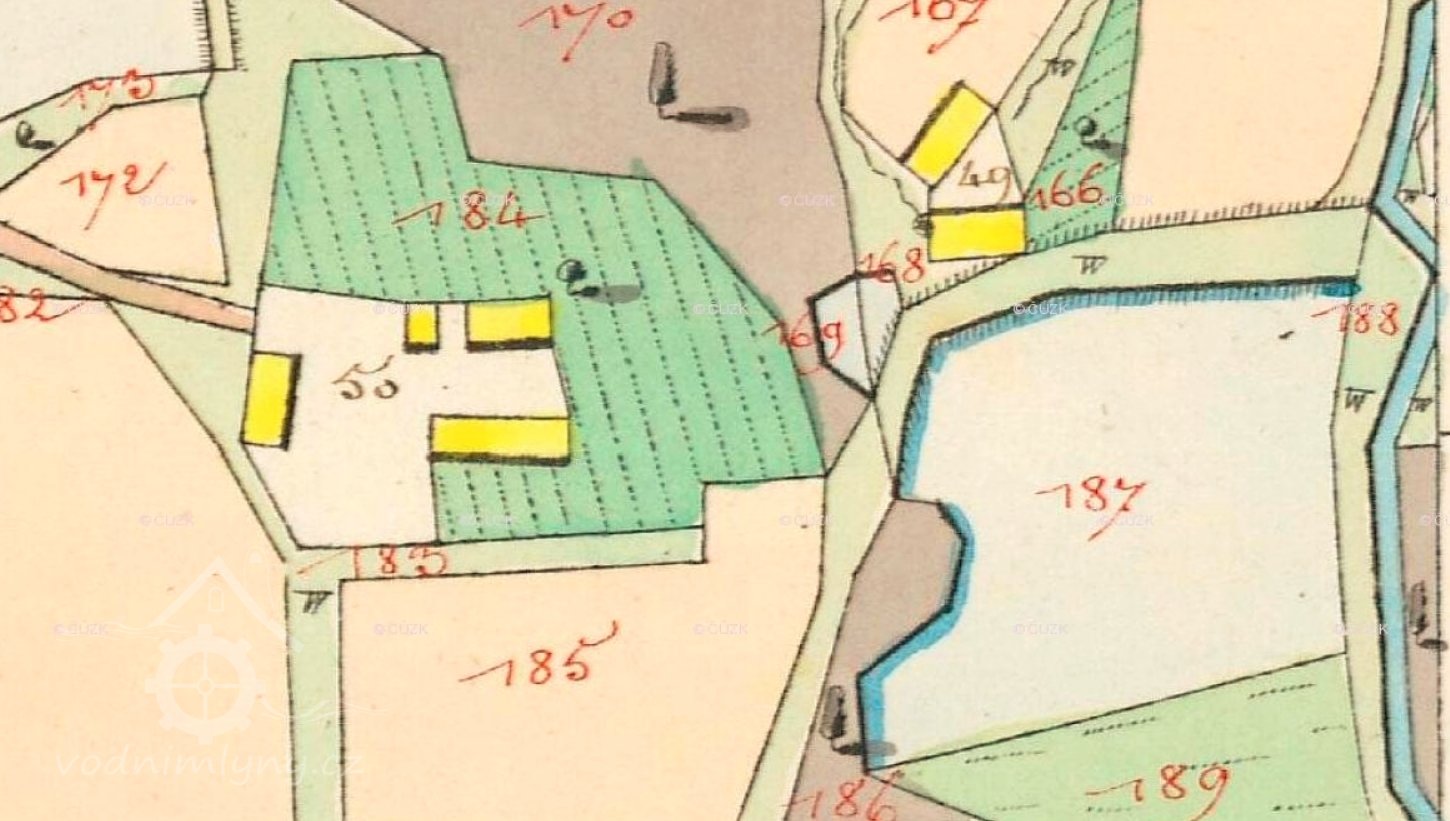 Areál stojí pod hrází rybníka na pč. 187. Ten stával při levém břehu Frýdeckého potoka. Není zobrazen náhon, jen nitkovitá strouha, kterou napájel právě rybník a ta se vlévala do potoka. Mezi mlýnem a rybníkem stával ještě jeden malý rybníček na pč. 169. Dodnes se zachovala menší západní polovina rybníka na pč. 187.