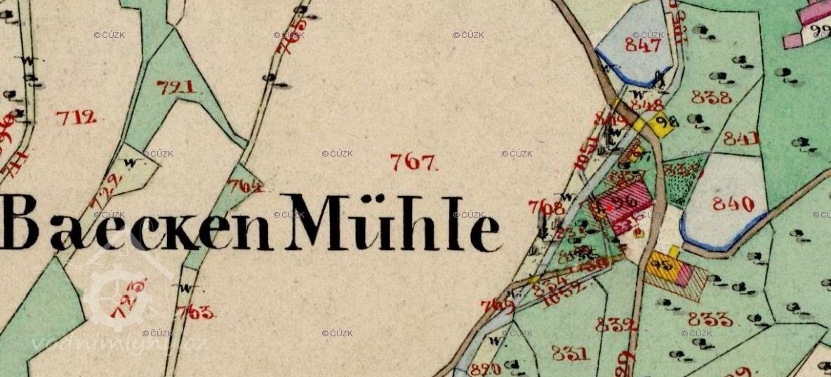 Pekařský mlýn je překlad názvu Bäckenmühle nebo také Beckenmühle (5) jak se mu lidově říkávalo asi proto, že byl v Janově prvním mlýnem spojeným s pekárnou. Domněnku potvrzuje zápis v účetní knize města Mostu z r. 1738. Tehdejší mlynář Josef Frantzel byl jediný v Janově, kdo mimo mlýnské dávky 14 zlatých 10 krejcarů platil pekařský poplatek šest zlatých ročně. Mlýn koupil za 220 zlatých, obnos byl vyúčtován v r. 1740. V zápise je Frantzel nazýván „hořejší mlynář". Jméno se objevuje také v seznamu podniků obtížených povinnostmi vůči vrchnosti města Mostu, jak již na jiném místě uvedeno. Aby se mlynář zbavil těchto povinností, zaplatil v r. 1848 výkupné ve výši 1800 zlatých.