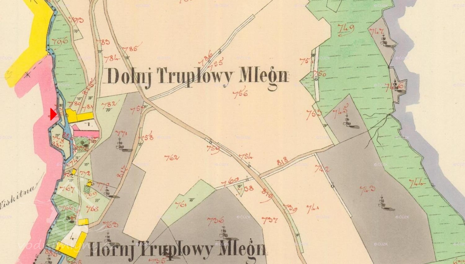 Protokol z 15.6.1891 uvádí: „Mlýn č.2 v Opatově, tzv. Dolní Truplový mlýn, má jedno mlýnské složení a čtyři stoupy na kroupy. Celkem má dvě vodní kola na vrchní vodu, z nichž horní mlýnské má průměr 2,85 m a šířku 0,48 m. V mlýnské nádržce před mlýnem jest jalový splávek 2,20 m široký s hradícími prkénky 40 cm vysokými. Na začátku mlýnského náhonu jest v potoce hradící stavidlo 2,25 m široké a 27 cm vysoké od prahu. Fixní bod byl zasazen při břehu vodní nádržky na č. parc. 778 ve vzdálenosti 10,05 m od rohu stájí a kolmo 8,80 m ode zdi zahrádky. Sestává se z kamenného sloupce, na jehož povrvhu jsou vytesána písmena J.S. 1891, tento povrch (hlava) zbačí kontrolní bod. Vodní cejch nebylo třeba stanovit.“
