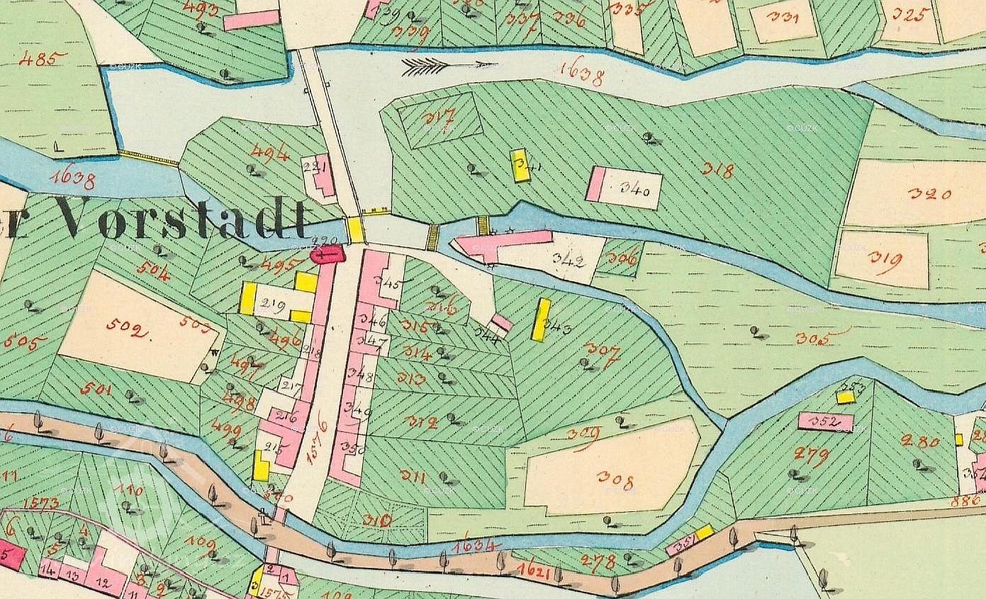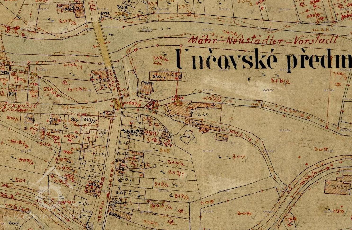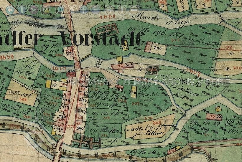 U ramene řeky Moravy, zasypaného při regulaci v roce 1930, stával Špitálský mlýn se zajímavou mansardovou střechou.