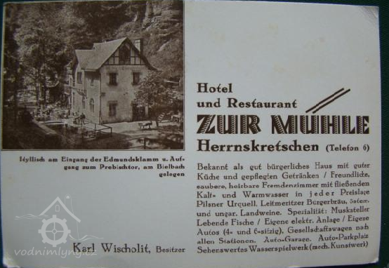 V r. 1921 a 1930 je psán majitel Carl Wischolit, "Hotel u mlýna", který zde provozoval i elektrárnu. (RR).