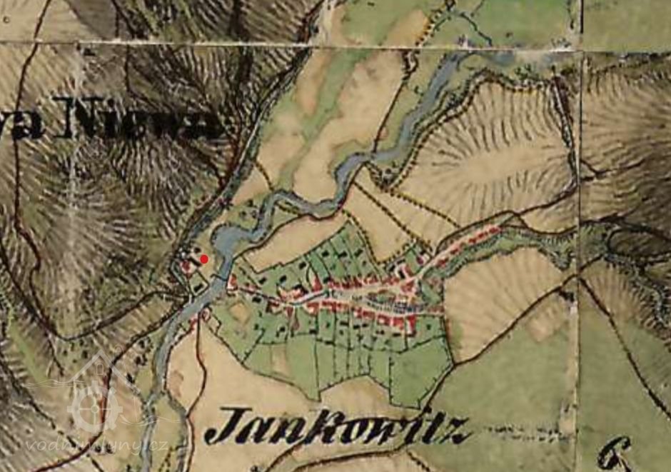 Vodní náhon na tento mlýn protékal podél již zbořené budovy valchy před Jankovicemi, která po dobu provozu také vodu využívala.