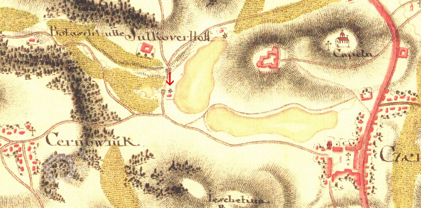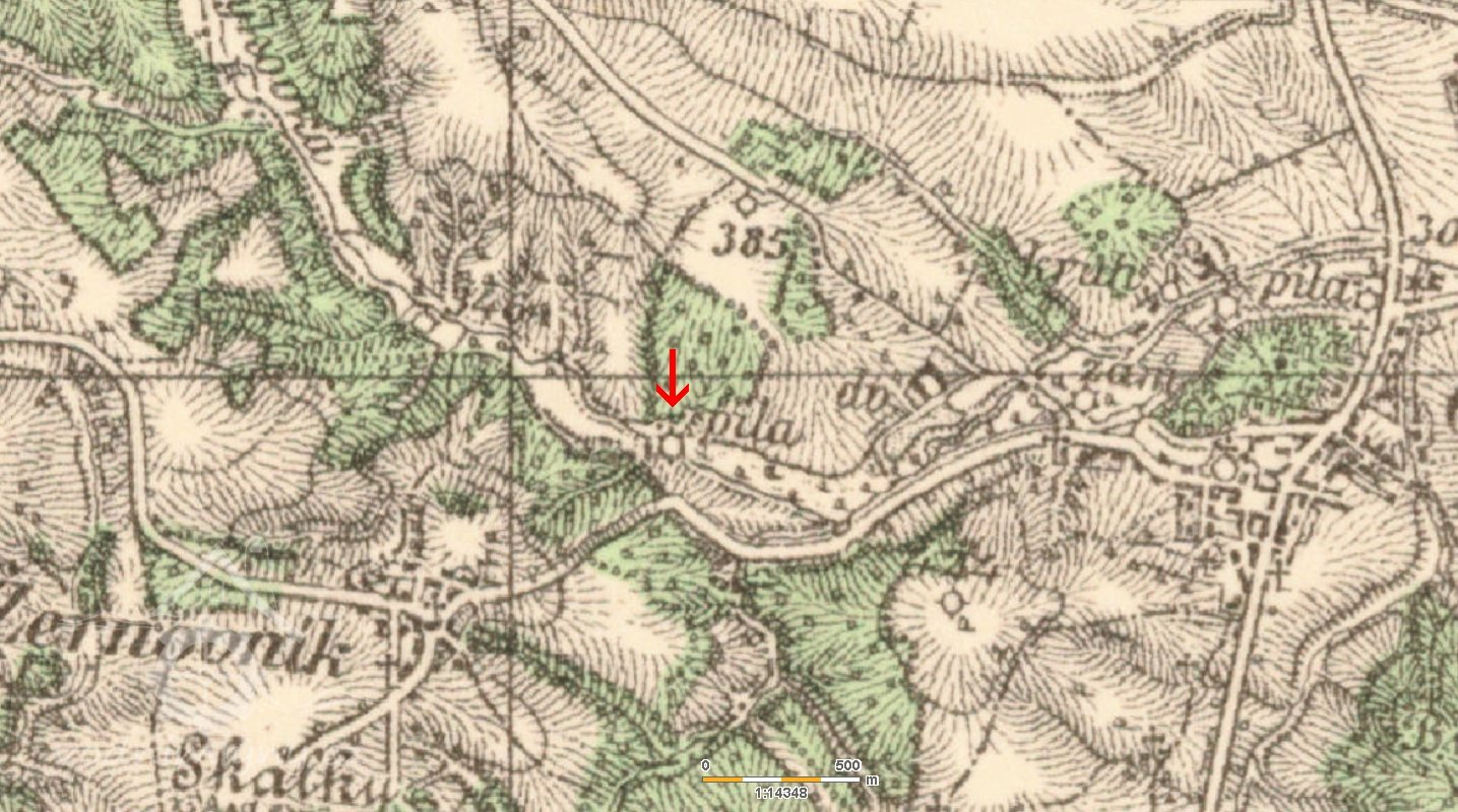 1909 rodina Šlesingerova nechala nedaleko u cesty zbudovat kamenný kříž [Heger] (pravděpodobně k památce sekerníka Šlesingera) Vyrobila firma Černohlavek Královo Pole v té době samostatná obec. [Vladimír Franc]