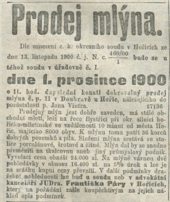 V následujících letech mlýn často měnil majitele, ale vždy pouze se souhlasem vrchnosti. V polovině 19.století náležel mlýn Leopoldu Duškovi, který nechal vlastním nákladem vystavět silnici ke křižovatce u budoucí restaurace Doubravka (N 50 22.070 E 015 38.860). Mlýn byl v té době přízemní a patřila k němu i pila využívající vodní síly. Následujícím majitelem se stal známý hořický podnikatel Václav Tomášek, který mlýn zvelebil, přistavěl první patro a provoz vybavil parním strojem, který nahradil vodní sílu v obdobích sucha. Nástupci pana Tomáška Janu Vintrovi se příliš nedařilo a po jeho smrti v roce 1900 mlýn prodala mlynářova vdova v dobrovolné dražbě.