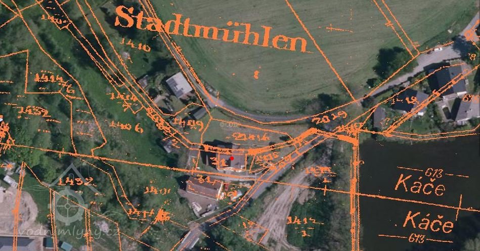 Bývalý mlýn na pc. 326/1 (prý nedávno brutálně přestavěn) pod hrází rybníka Kačer se zachovalým kusem náhonu (jde vidět na KM i přímo v terénu za plotem před býv. mlýnicí, možná i podél ní ?). Na Z straně možná turbínový domek. Odvodní kanál směřoval dále do dnes již neexistujícího rybníka před čp. 51. Druhý z rudolfovských městských mlýnů (viz. http://vodnimlyny.cz/mlyny/objekty/detail/4166-rybaku-mlyn). Kačer je propojen s rybníkem Královským - na tomto náhonu je právě zmíněný Rybáků mlýn (kanál je zřejmě místy zakryt - ortofoto) - resp. předtím soustava potokem Čertík až z Mrhala...