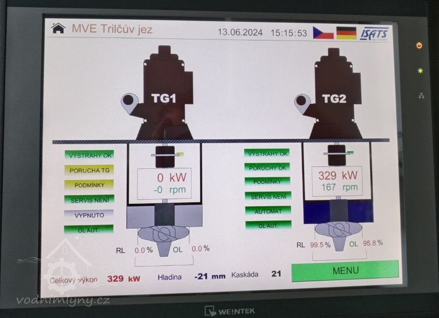 1) hltnost 2,4 m3/s, spád 1,5 m, výkon 36 HP