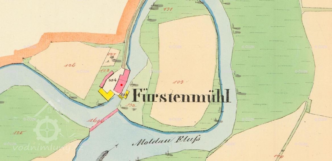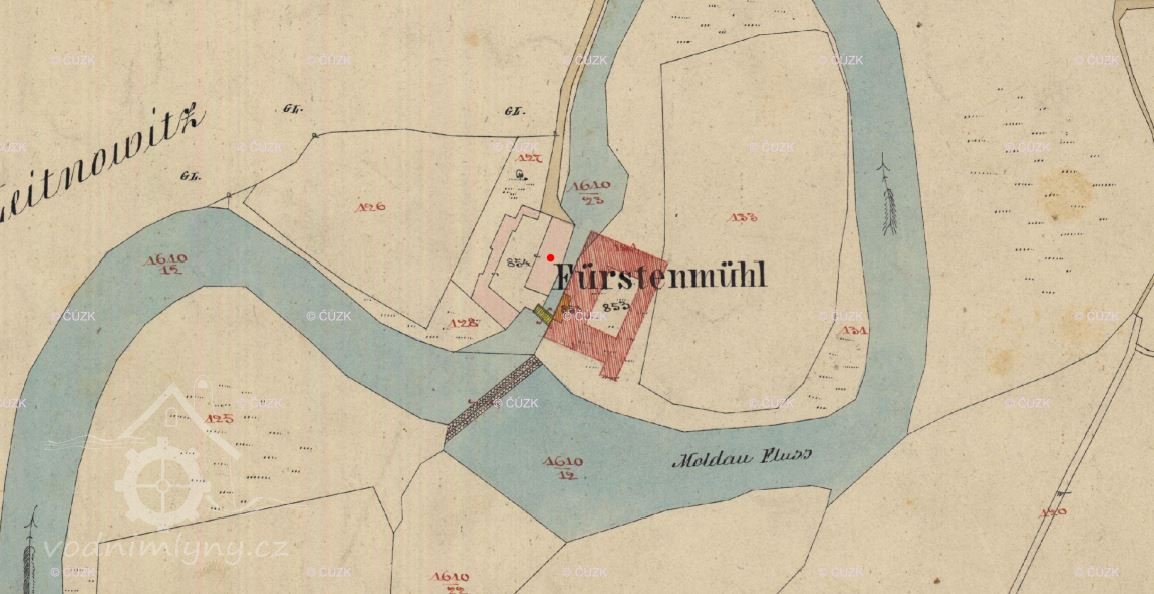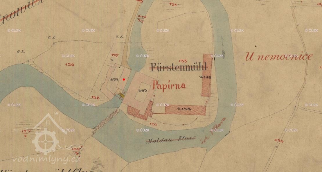 Mlýn se uvádí jako Knížecí, Fürstenmühle neboli Papírenský. Původně mlýn Václava Trojana na Lineckém předměstí č. 10 s 8 vodními koly a vodním právem - 1880 odkoupen na papírnu, 1920 sem propojena vlečka, 1937 vodní elektrárna na jezu v souvislosti s regulací Vltavy (Trilčův jez). Více k historii: http://encyklopedie.c-budejovice.cz/clanek/papirna. Dále viz. pozn. "Ostatní".