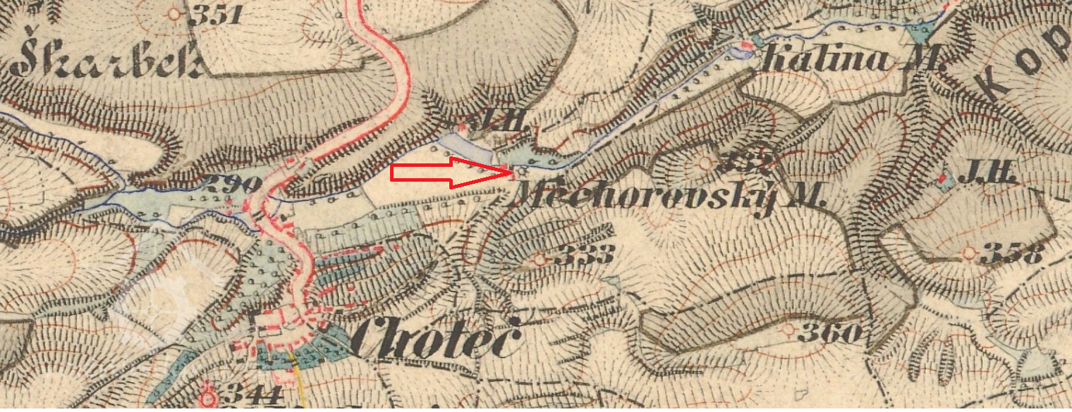 První písemná zmínka o obci Choteč pochází z roku 1336, avšak jméno jako takové bylo použito k pojmenování zdejšího potoka již v roce 1115.[i] Roku 1666 je poprvé zmiňován mlýn.[ii] Tehdy sem přišel ze mlýna pod Chejnicemi nový nájemce Měchurka. Povědomí o názvu „Měcháčův mlýn“ se dochovalo dodnes – tedy přes 340 let. Další zajímavou zmínkou je, že mlýn byl roku 1768 prodán jako dědičný majetek Janu Dočkalovi za 1000 zlatých rýnských a již v roce 1774 Václavu Michudovi s manželkou Annou za 2290 zlatých. Lze se domnívat, že za svého působení mlynář Dočkal budovu výrazně přestavěl, a tak zdvojnásobil její hodnotu. Za velmi podobnou částku – 2250 zlatých – koupil objekt roku 1776 Václav Veselý s manželkou Františkou. Mlýn měl na konci 18. století dvě složení a jednu stoupu.