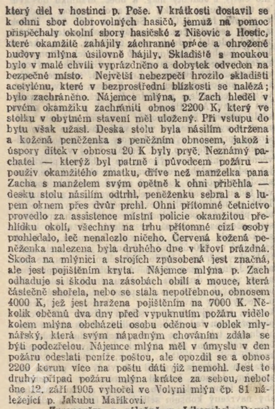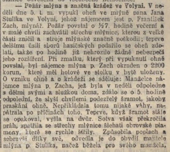 1905 majitel Jan Stulík, nájemce mlýna Zach. V tomto roce vypukl ve mlýně požár.