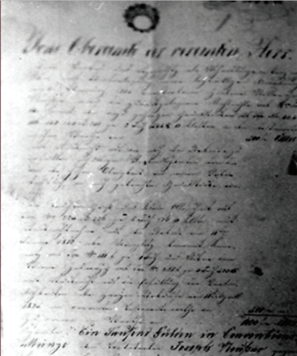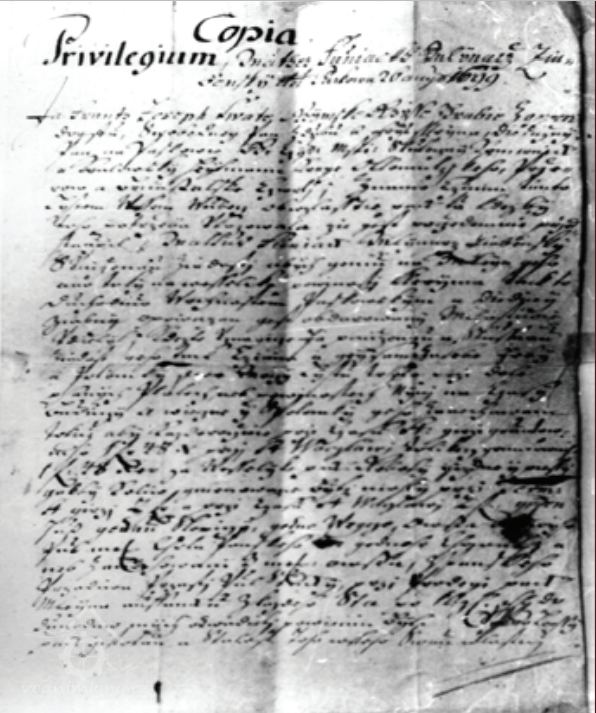 Ja Franz Joseph Svate Ržymske Ržisse Hrabě z Oppersdorfu, Svobodný Pan z Dubu a Frydstegna, diedicžný Pan na Paskowě, Jeho Czýskeg a Kralowskeg Milostj Skutecžny Komornik a Králowský Hegtman krage Olomútskeho Pržerow a Bruntalskeg Sstwrti. Znamo cžynim týmto listem wssem wubecz, obzwlasstiapak tu, když by toho potržeba ukazovala, že gest Przede mnie Pržedstoupil Mathúss Funiack Mlynarž Žabensky z uniženau Žadosti, abych gemu a Mlýn geho ano taki nawsselike Powinosti, který ma tak do důchodůw wrchnostem Paskowskim a diediny – Žabney opowazan gest obdarowaný Milostiwie udielil, kdežto uznagicze Ja poniženau a slussnau žadost geho, tak cžinim a sam ze sebe, Erby, Potomky swee Moczy listu tohoto přzy dole psanich platech, neb powinostech niny na Čzasy budauci, a wiecžnei Potomky zanechawam, totiž aby každocžnie prži Czasu Sw. Giržy Gruntowniho jeden Reynsky 48 kr. pržy Sw. Waczlawie tolikež Gruntowniho jeden Reynsky 48 kr. za wsselike pak roboty gizdne i Piessy gak by koliw se mohly gmenowatj pržy terminu Sw. Giržy dwa Reynsky a pržy cžasu Sw. Waczlawa tež dwa Reynskey Gegnu Hus, gednu slepyczy, gedno Wegcze, owsa prwniho půl Mieržiczy, Chrta Panskeho gednoho chowatj aneb za nechowanj trzy Mierž. Owsa, z Panskeho Przediwa půl sstúky, pržy prodegy pak Mlegnaaučanku z každeho Sta po deseti zlatich do důcodůw mych odwadietj powinen byl. Pro lepszy Gistotu a Stalost wsseho Swau wlastnj Rukau tento list gsem podepsal a pecžeti przyrozenau pržy wiedomie potwrditj dal Genž sr stalo na Zamku Paskowskem.