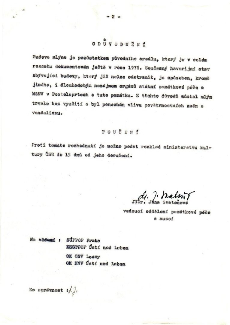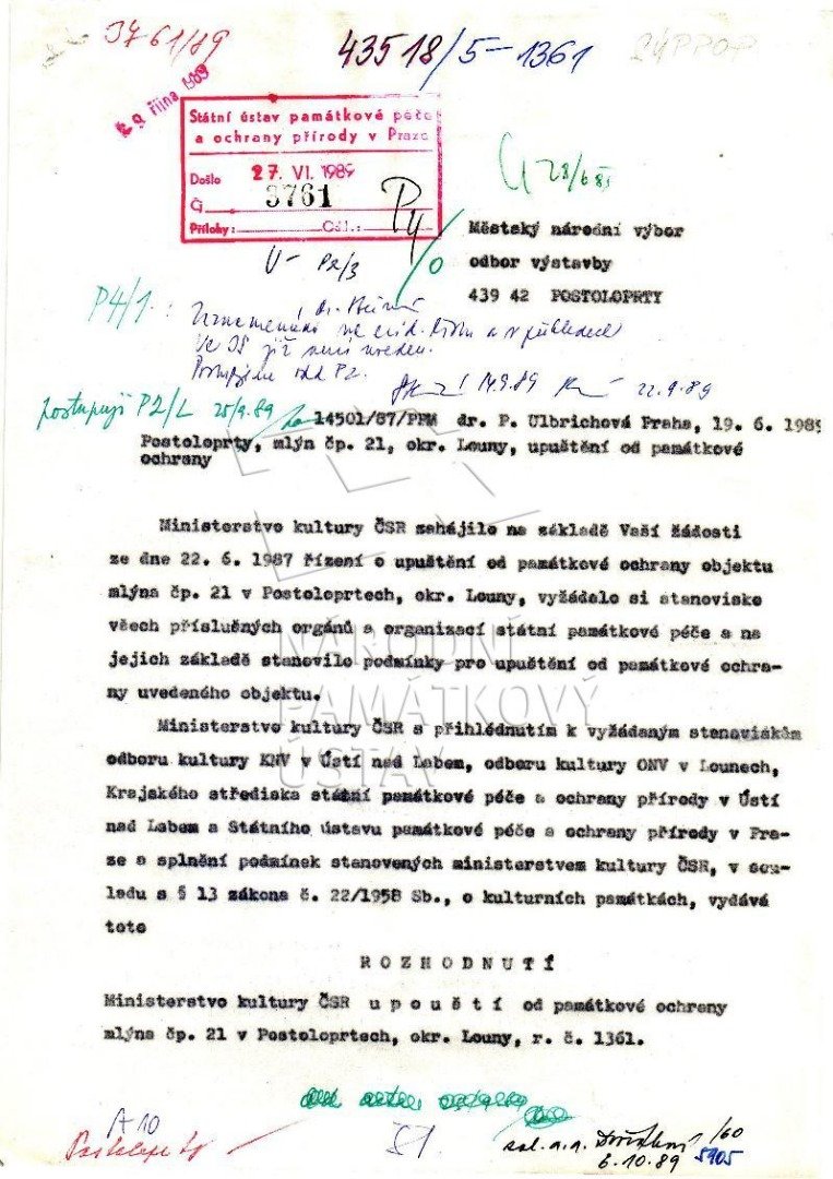 1989: Budova mlýna je pozůstatkem původního areálu, který je v celém rozsahu dokumentován ještě v roce 1976. Současný havarijní stav zbývající budovy, který již nelze odstranit, je způsoben kromě jiného i dlouhodobým nezájmem orgánů státní památkové péče a MěNV v Postoloprtech o tuto památku. Z těchto důvodů zůstal mlýn trvale bez využití a je ponechán vlivu povětrnostních změn a vandalismu.
