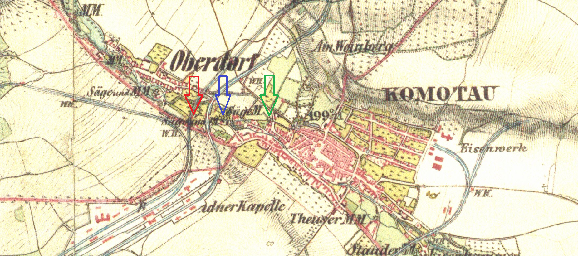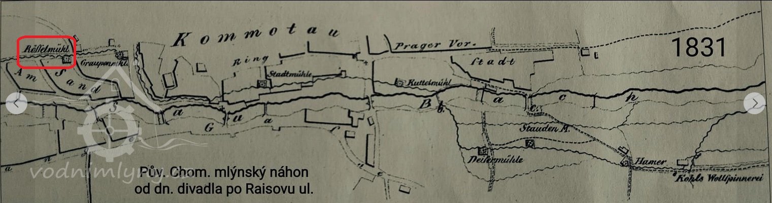 Cesta vody ke mlynu vedla z toku Chomutovky vlastnim zpevnenym pozemnim privodnim kanalem priblizne z pozice 50.4632358N, 13.4088611E podel Stefanikovych kasaren. Odtok vody veden podzemnim velkoprumerovym potrubim zpet do toku Chomutovky s vyustenim u dnesniho obchodniho domu Centrum ( priblizne 50.4608458N, 13.4148631E ).