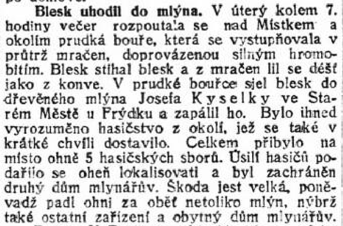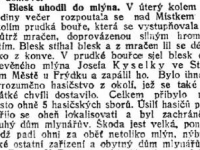 Dřevěný mlýn byl v srpnu 1917 za mlynáře Josefa Kyselky zapálen bleskem a následně zcela vyhořel včetně obytného domu. Poté již zřejmě nebyl obnoven.