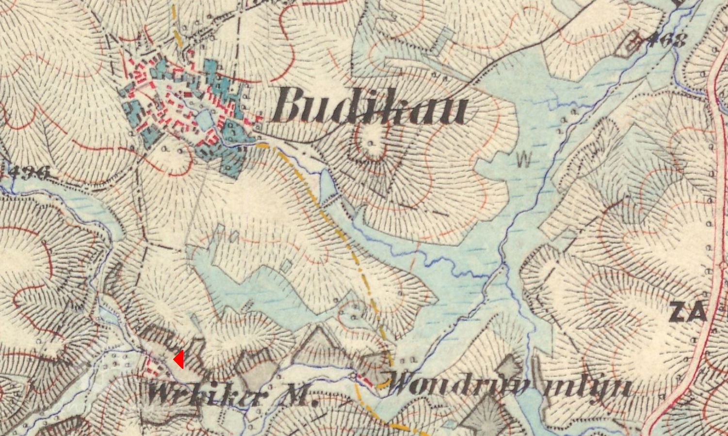 Mlýn čp. 22 v Budíkově leží na pravém břehu Světlického potoka. Před mlýnem se nachází nad obecní cestou malá vodní nádržka – rozšířený mlýnský potok, v níže je zřízen malý splávek se stavidlem pro odpad nepotřebné vody. Dále je z nádržky vedena pod obecní cestou roura 50 cm široká a 24 cm vysoká, uzavíraná ze strany nádržky stavidlem, kterou se pouští voda do mlýnské strouhy.