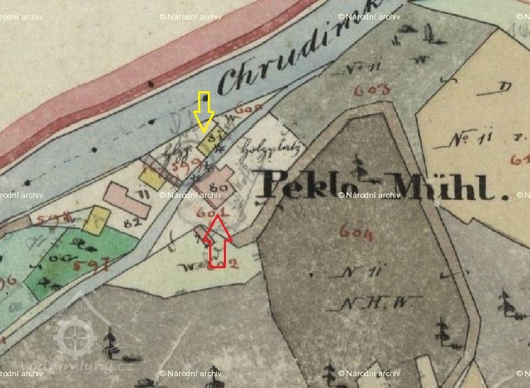 Náhon z Chrudimky odbočoval u jezu doprava ve vzdálenosti asi 350 m nad mlýnem. Odtok od mlýna se vracel do řeky přibližně po 50 m.