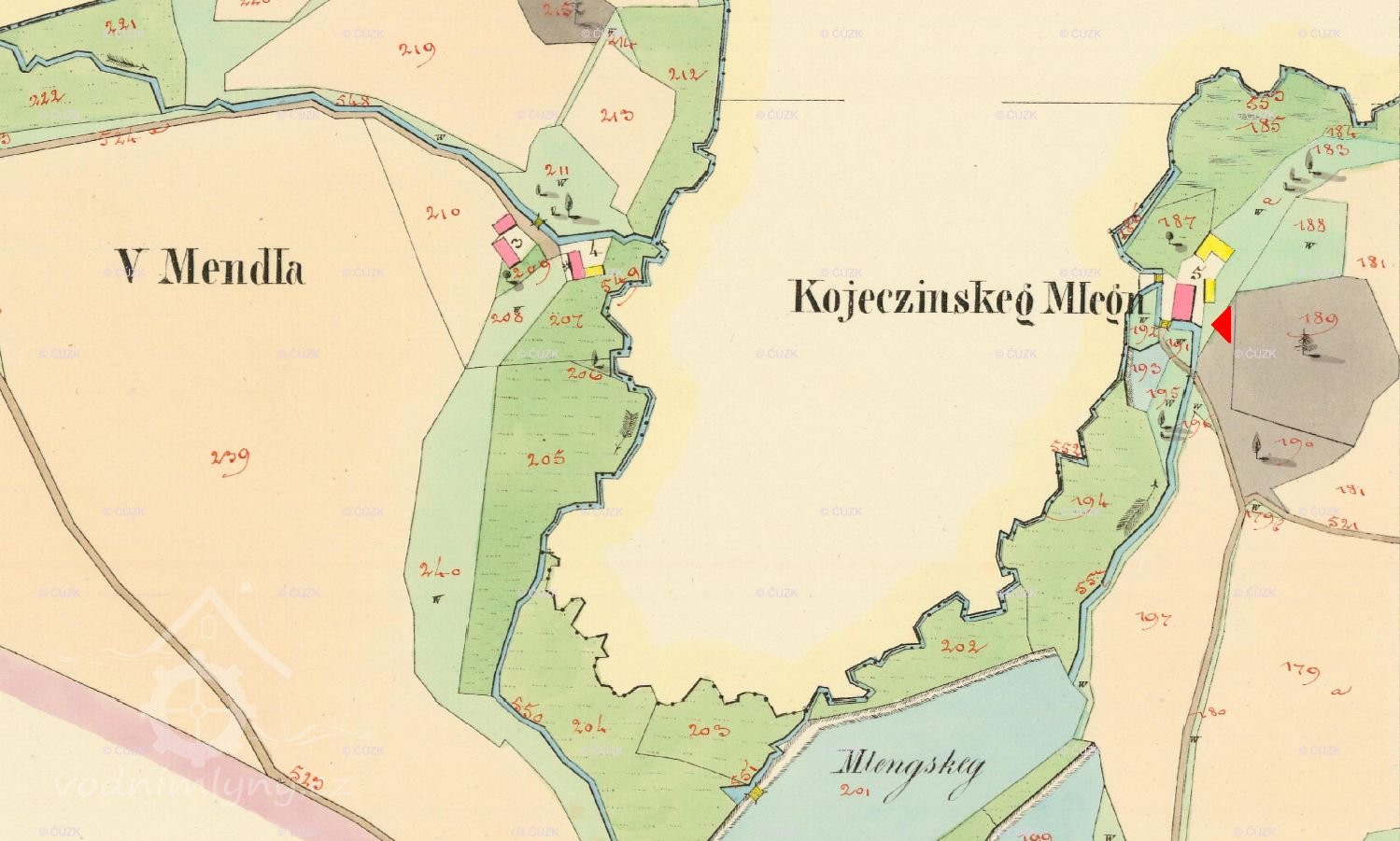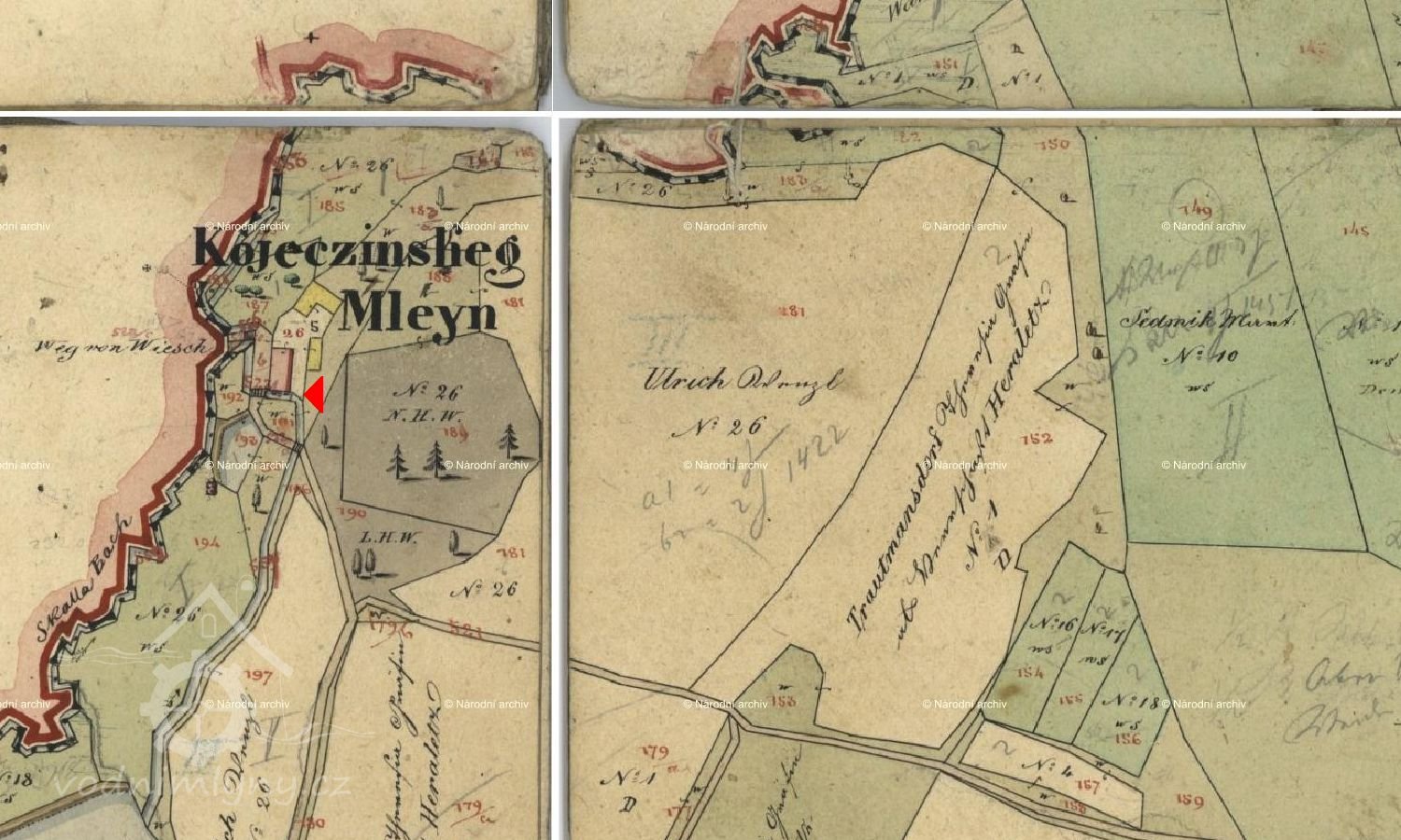 5. Kupující nepřivlastní si nic více mimo specifikovaných polí a luk nesmí z panské půdy dělat další pole, není oprávněn káceti dřevo na stavbu nebo jinou potřebu, nýbrž musí si toto opatřiti proti hotovému zaplacení buď od zdejší vrchnosti nebo odjinud mimo panství. Naproti tomu je povinen kupující a příští vlastník tohoto mlýna odebírati všechno potřebné palivové dřevo a to nejméně 10 sáhů ročně, dále všechny nápoje proti hotovému zaplacení v běžných cenách přímo od zdejšího panství a nesmí si tyto opatřovati odjinud pod trestem zabavení /konfiskace/ pokuty a vězení.