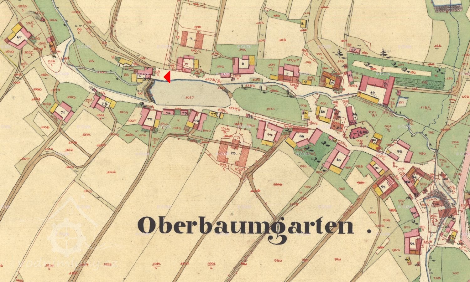 Voda využívána k pohonu mlýna o dvou složeních a 1 stoupě. Výpustný žlab rybníka má 2 stavidla 0,6 a 0,65 m široké, obě 2,1 m hluboká. Mlýnský žlab je 3,585 m dlouhý, 1,15 m široký a 0,77 m hluboký se dvěma stavidly ke kolům 0,63 m širokými a 0,7 m vysokými. Dvě kola na svrchní vodu, pro mlýnské složení průměr kola 3,64 m, pro stoupy průměr 3,48 m.