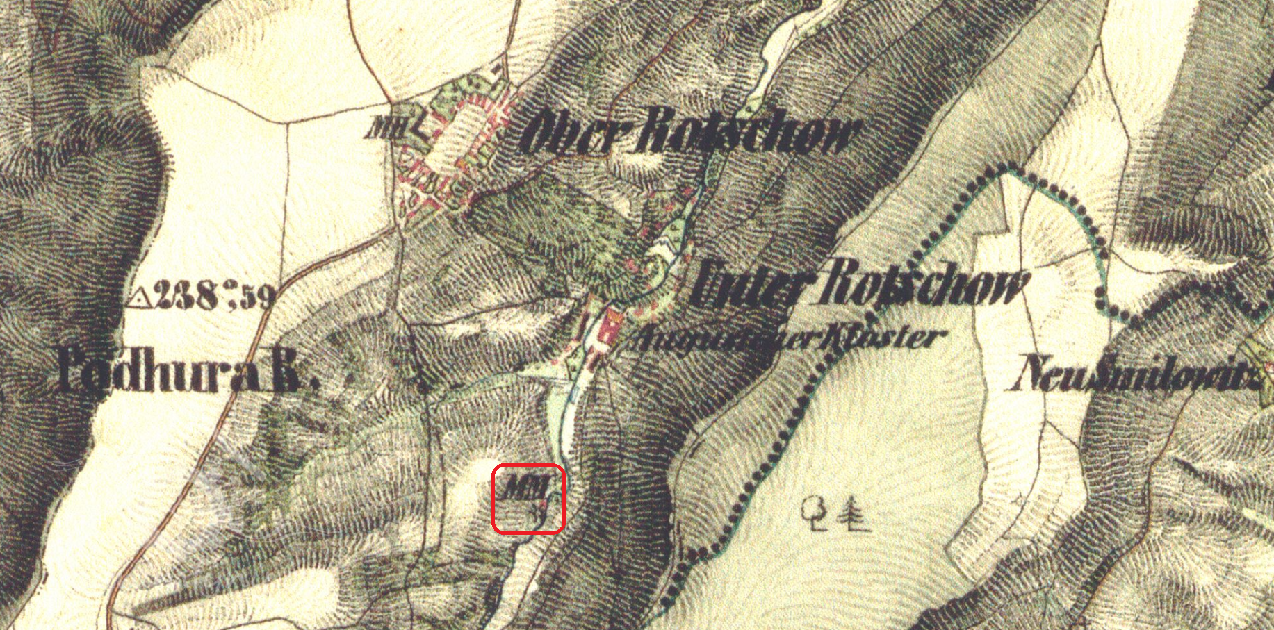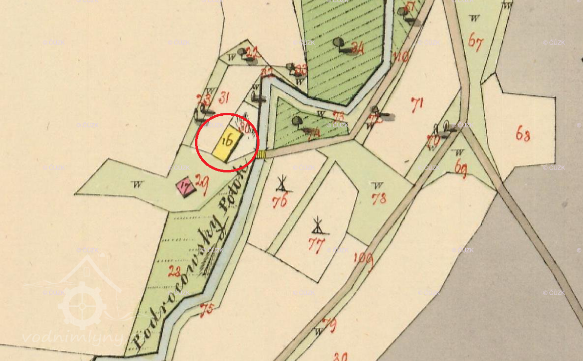 Malý, dávno zaniklý (v roce 1841 již nebyl v provozu) mlýn, první na Klášterském (Třebockém) potoce. Pozoruhodné je, že ač z budovy již nezůstaly žádné stopy, cesta k mlýnu (a donedávna prý i můstek) zůstává v terénu stále patrná.
