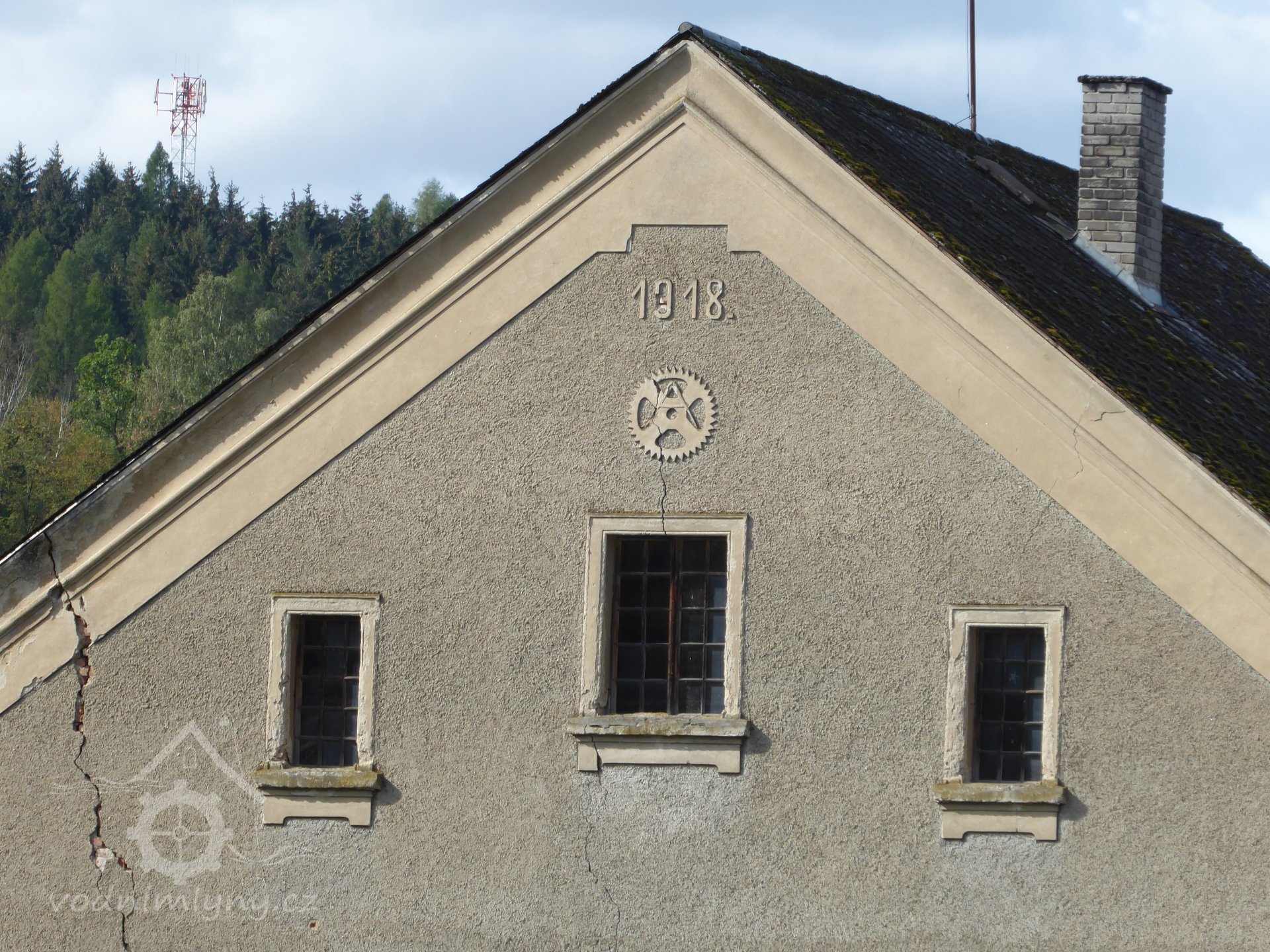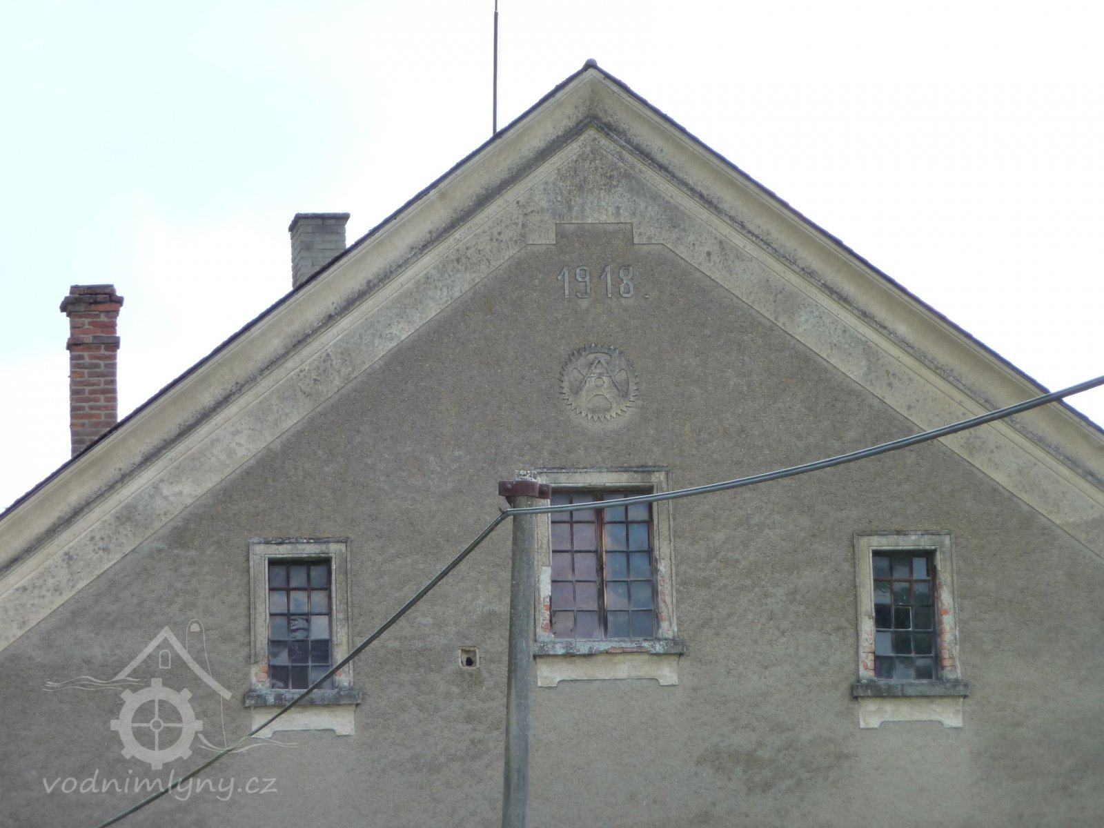 Na štítě mlýna je mlynářský znak a letopočet 1918