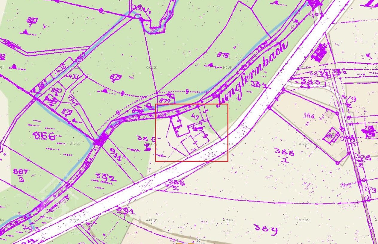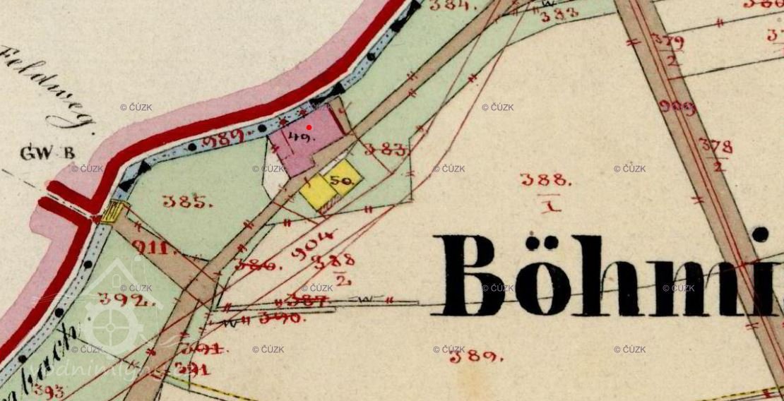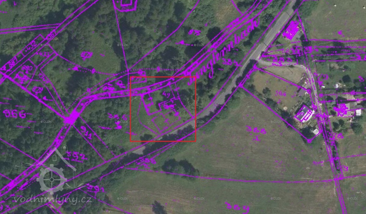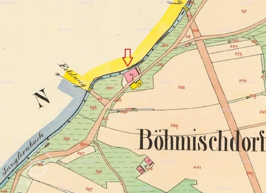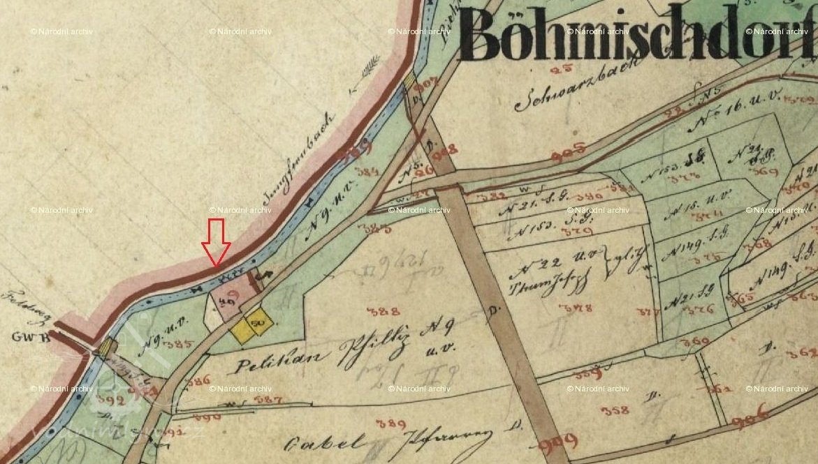 Mlýn je zakreslen na mapách II. vojenského mapování a na mapách stabilního katastru, kde je v roce 1843 uváděn mlynář Filip Pelikán. Tehdy měl mlýn čp. 9.