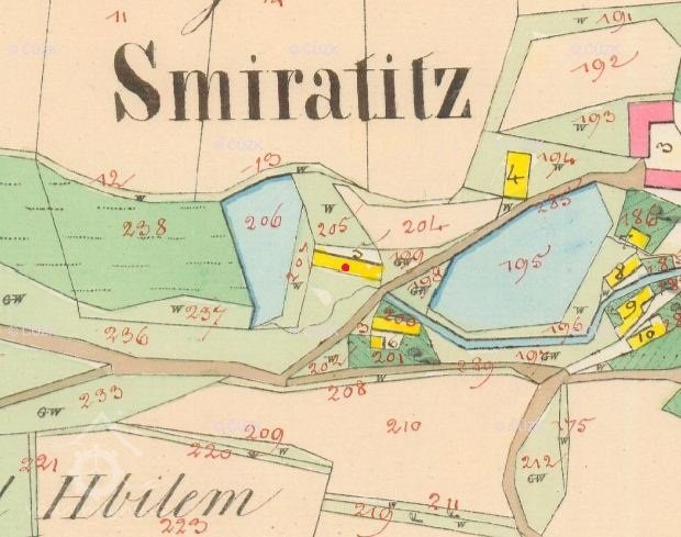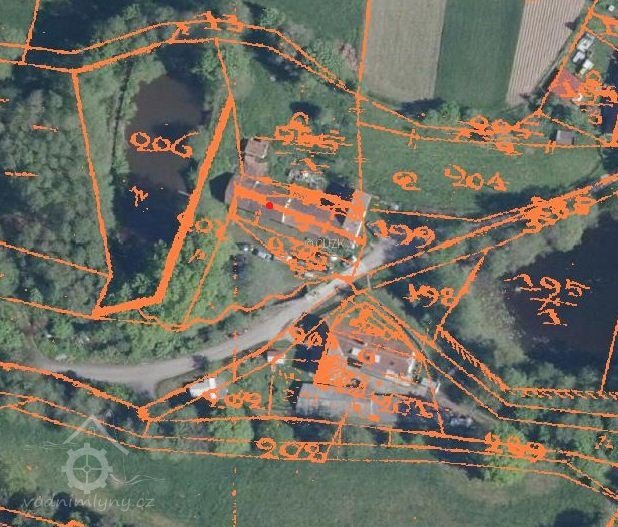 Uzavřený areál bývalého vodního mlýna má mlýnici a přilehlou stodolou do tvaru písmene L s vjezdem z východní strany. (JV)