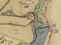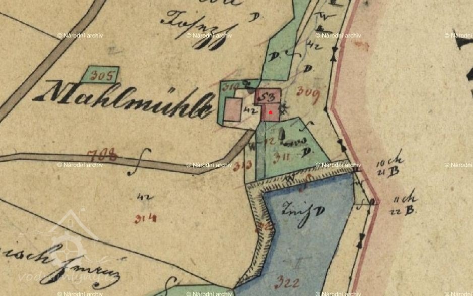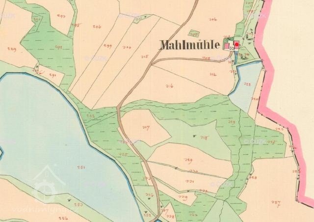 Zaniklý mlýn Holuška pod stejnojmenným rybníkem. Mlýn dohledán již na I. vojenském mapování. Budova mlýna zanikla v průběhu 1. poloviny 20. století, protože na leteckém snímkování z roku 1949 se již žádné stavení nenachází. (JV)