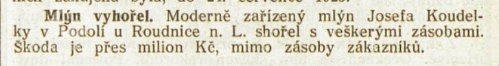MLýn v roce 1923 vyhořel. Škoda byla přes milion. Je otázka zda mlýn nadále mlel.
