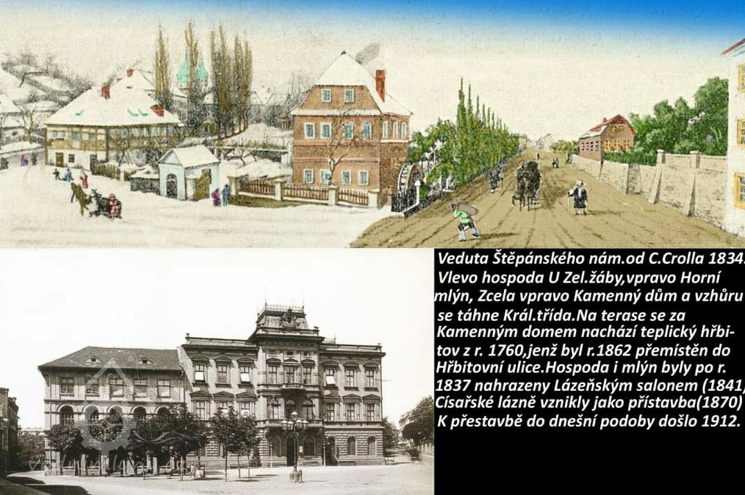 Neustále se rozrůstající lázeňské město se roku 1840 rozhodlo starou hospodu zbourat a její místo zaujal tzv. Lázeňský nebo též jinak zvaný Kávový salon. Roku 1870 došlo též ke zboření horního mlýna a na jeho místě vznikla první klasicistní verze Císařských lázní, která se spojila s Kávovým salonem v jeden celek. Postupem času při přestavbě lázní došlo rovněž ke zboření Kávového salonu a lázně pak získaly poněkud jiný vzhled, který známe ze současnosti. Dnes by už sotva kdo na staré Crollově vedutě poznal, kde se tento kout lázeňských Teplic nacházel."