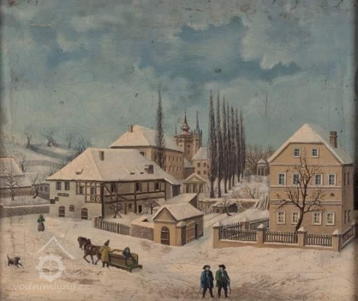 Velmi starou žánrovou zimní vedutu na Mlýnském náměstí vytvořil malíř C. Croll roku 1834. Vpravo spatříme horní mlýn, vlevo hospodu U Zelené žáby, kde bývalo velmi živo. Za hospodou směrem vpravo se nachází cesta lemovaná topoly, která stoupá vzhůru k Lázeňskému náměstí. Jedná se o pozdější Seumeho a dnešní Rooseveltovu ulici. Vpravo od mlýna pak již není na vedutě vidět ulici stoupající vzhůru, která se dnes jmenuje U Císařských lázní.