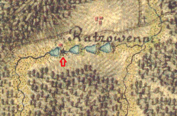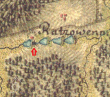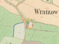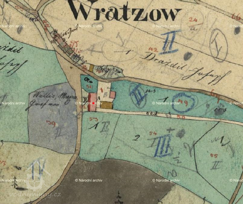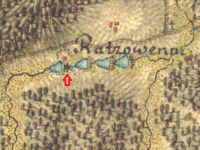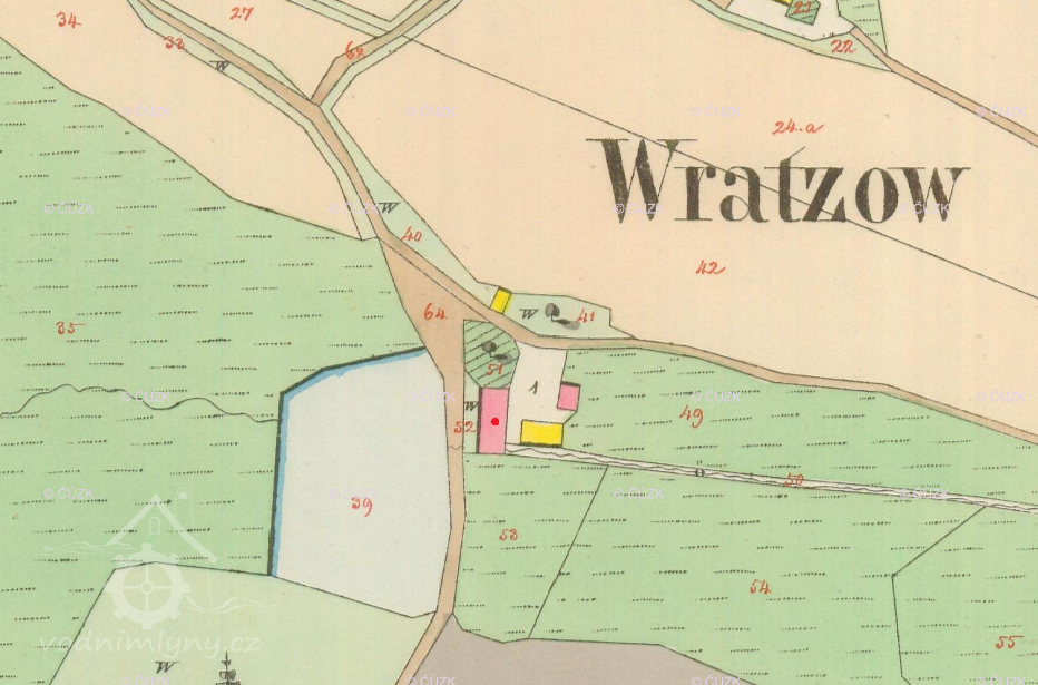 V 1. vojenském mapování z let 1764 - 1768 je objekt označen jako Ratzowen mühle. Pod mlýnem další tři rybníky. Na mapě císařského povinného otisku Stabilního katastru z roku 1837 je označen mlýn červeně, dále je zde žlutě zakreslena dřevěná budova starší stodoly a ještě menší zděná budova ležící naproti budově mlýna. Jde patrně o chlévy nebo sýpku. Níže položené rybníky již neexistují, jsou zde zakresleny pouze pozůstatky hrází.